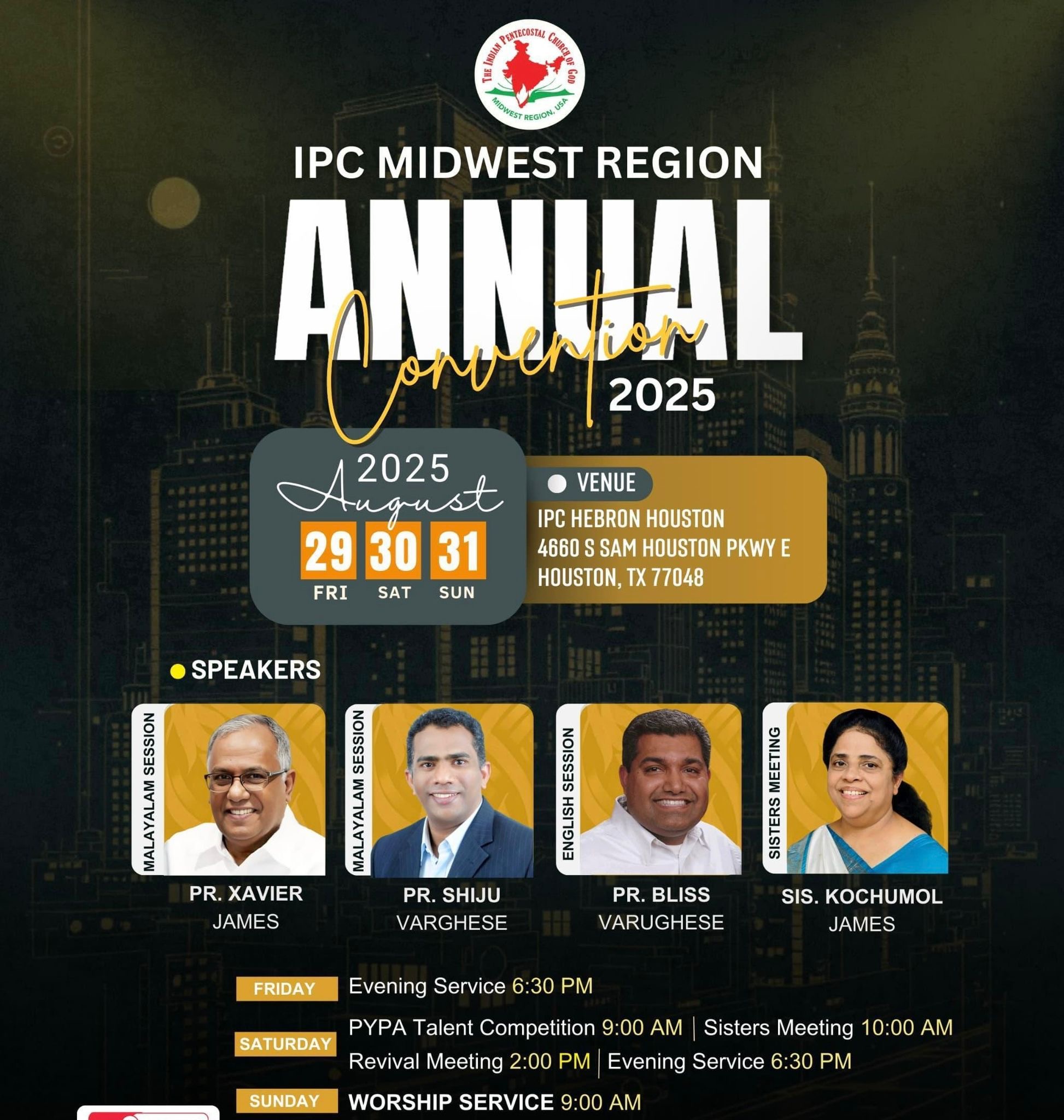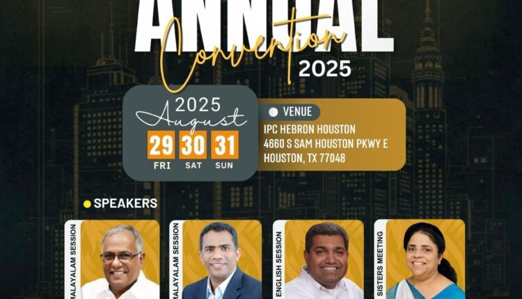 ഹൂസ്റ്റണ്: ഐപിസി മിഡ് വെസ്റ്റ് റീജിയൻ കൺവൻഷൻ 2025 ആഗസ്റ്റ് 29 മുതൽ 31 വരെ ഹൂസ്റ്റൻ