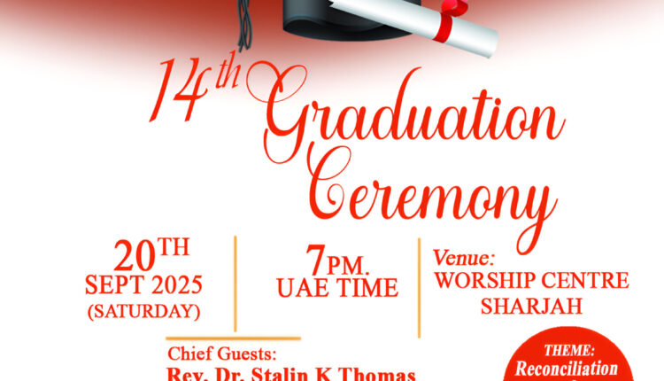 ഷാർജാ : ഇന്റർനാഷണൽ അസോസിയേഷൻ ഫോർ തിയോളജിക്കൽ അക്രെഡിഷൻ (IATA) അംഗീകാരം ഉള്ള വർഷിപ് സെന്റർ കോളേജ് ഓഫ് തിയോളജിയുടെ 14-മത് ബിരുദദാന സമ്മേളനം സെപ്റ്റംബർ 20, ശനിയാഴ്ച വൈകിട്ട് 7 മണിക്ക് ഷാർജാ വർഷിപ് സെന്റർ മെയിൻ ഹാളിൽ നടക്കും. റവ. ഡോ. സ്റ്റാലിൻ കെ . തോമസ് (IATA ഇന്റർനാഷണൽ ഡയറക്ടർ), റവ. ഡോ. ജെയിംസ് ആൻട്രു വിൽസൺ, കാനഡ (IATA ഇന്റർനാഷണൽ ഓർഗനൈസർ) എന്നിവർ മുഖ്യ അതിഥികൾ ആയിരിക്കുമെന്ന് കോളേജ് ഡയറക്ടർ റവ. ഡോ. വിൽസൺ ജോസഫ് അറിയിച്ചു. ഇന്ത്യ പെന്തകോസ്ത് ദൈവസഭയുടെ (ഐപിസി) അംഗീകാരം ഉള്ള മിഡിൽ ഈസ്റ്റ്ലെ ഏക ബൈബിൾ കോളേജ് ആണ് വർഷിപ് സെന്റർ കോളേജ് ഓഫ് തിയോളജി. ഈ വർഷത്തെ തീം അനുരഞ്ജനവും ദൈവീക ദൗത്യവും (Reconciliation as the Mission of God) എന്നതാണ്. ക്രമീകരണത്തോടും അച്ചടക്കത്തോടും ആത്മസാന്നിദ്ധ്യത്തോടും, പ്രഗൽഭരും അനുഭവ സമ്പത്തുമുള്ള അധ്യാപകരാൽ പ്രവർത്തിക്കുന്ന ബൈബിൾ കോളേജിൽ നിന്നും നൂറുകണക്കിന് വിദ്യാർത്ഥികൾ ഇതിനോടകം ദൈവ വചനം പഠിച്ച് സുവിശേഷ വേലയിൽ ആയിരിക്കുന്നു. M.Th (മാസ്റ്റർ ഓഫ് തിയോളജി) M. Div (മാസ്റ്റർ ഓഫ് ഡിവിനിറ്റി) B. Th (ബാച്ലർ ഓഫ് തിയോളജി) D.Th (ഡിപ്ലോമ ഇൻ തിയോളജി) എന്നീ കോഴ്സുകളുടെ ബിരുദദാനം നടക്കുന്നതിനോടോപ്പം പുതിയ അദ്ധ്യായന വർഷത്തേക്കുള്ള കോഴ്സുകൾ സെപ്റ്റംബർ 24 ന് ആരംഭിക്കുമെന്ന് രജിസ്ട്രാർ റവ. റോയ് ജോർജ് അറിയിച്ചു. WCCT കൊയർ ഗാന ശ്രുശൂഷക്ക് നേതൃത്വം നൽകും.
