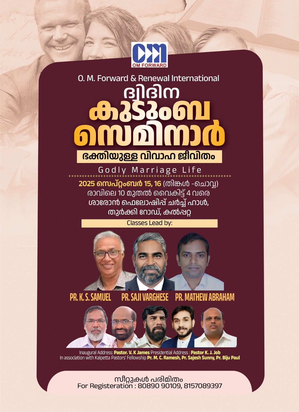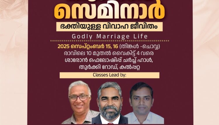 വയനാട്: ഒ. എം. ഫോർവേഡിന്റെയും റിന്യൂവൽ ഇന്റർനാഷണലിന്റെയും ആഭിമുഖ്യത്തിലും കൽപ്പറ്റ പാസ്റ്റേഴ്സ് ഫെലോഷിപ്പിന്റെ സഹകരണത്തിലും ‘ഭക്തിയുള്ള വിവാഹജീവിതം’ (Godly marriage life) എന്ന ദിദിന ഫാമിലി സെമിനാർ നടക്കും. സെപ്റ്റംബർ 15,16 തിങ്കൾ ചൊവ്വ ദിവസങ്ങളിൽ രാവിലെ10 മുതൽ 4 വരെ കൽപ്പറ്റ തുർക്കി റോഡിലുള്ള ശാരോൻ ഫെലോഷിപ്പ് ചർച്ച് ഹാളിലാണ് സെമിനാർ. എ. ജി. കൽപ്പറ്റ സെക്ഷൻ പ്രസ്ബിറ്റർ പാസ്റ്റർ വി. കെ. ജെയിംസ് ഉദ്ഘാടനം നിർവഹിക്കും.