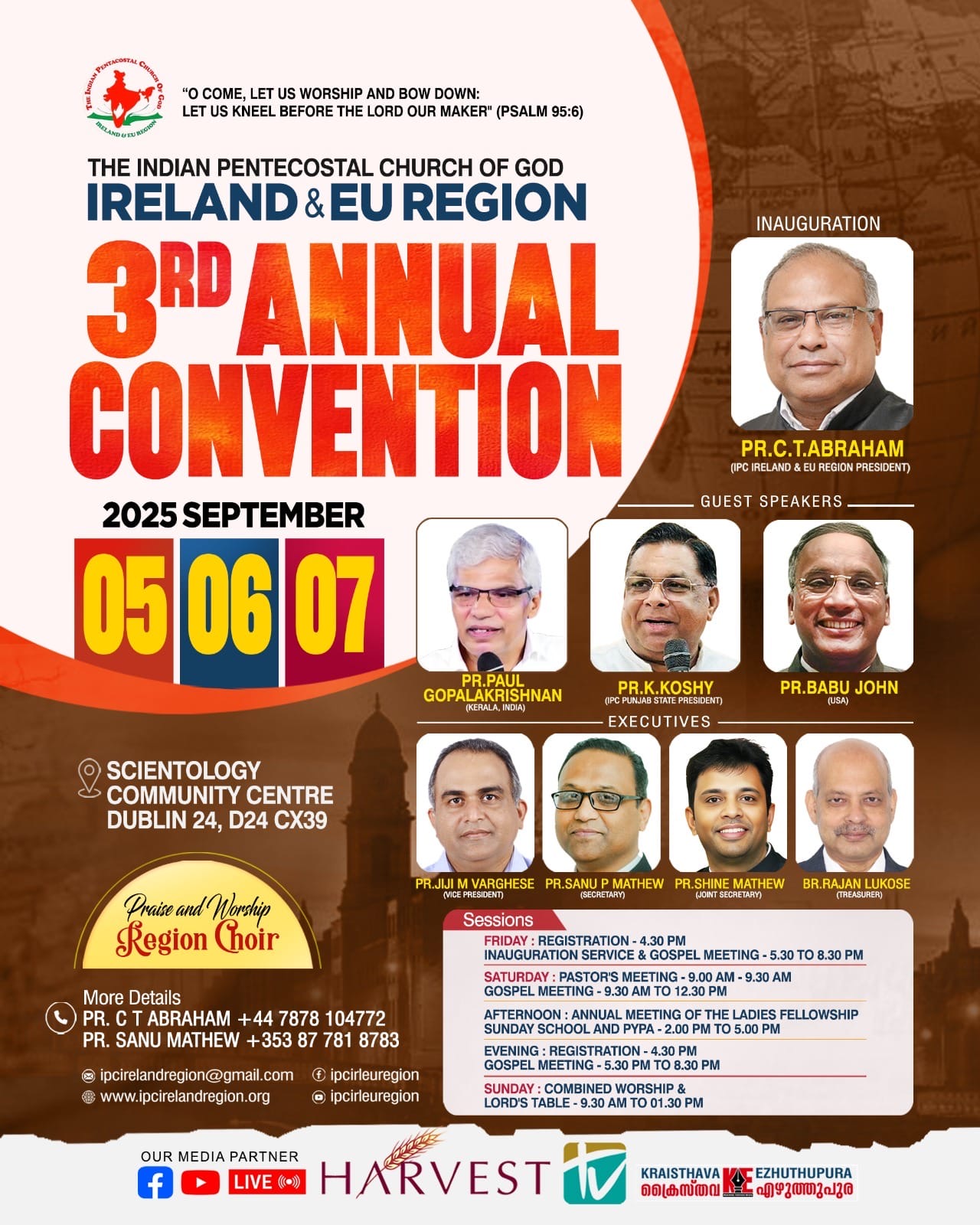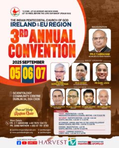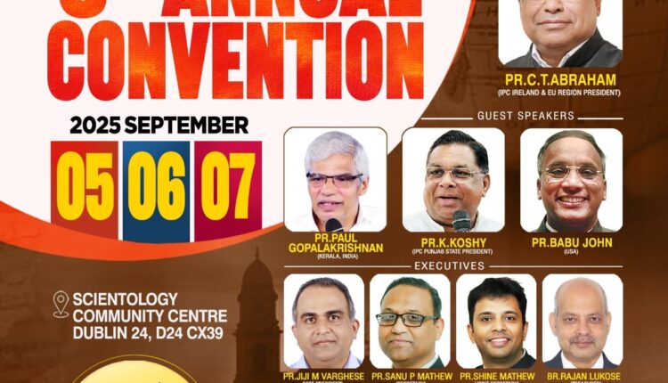 Dublin: The third annual convention of IPC Ireland & EU Region, the largest Pentecostal movement on the southwestern island of Ireland, part of the European continent, will be held from September 5th to 7th at the Scientology Community Centre in Dublin. The convention will be formally inaugurated on September 5th at 6:30 PM by Pastor C.T. Abraham, President of IPC Ireland & EU Region.
