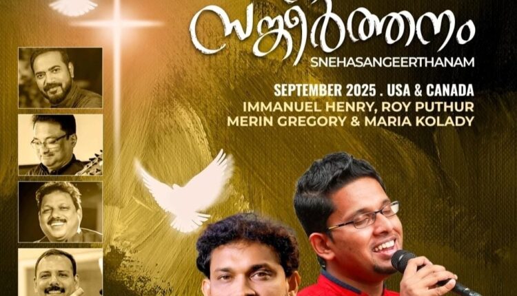 ഫ്ളോറിഡ: ക്രിസ്തീയ സംഗീത ലോകത്തെ പ്രമൂഖ ഗായകരായ ഇമ്മാനുവേൽ ഹെൻറി, റോയി പുത്തൂർ സംഘവും അവതരിപ്പിക്കുന്ന “സ്നേഹ സങ്കീർത്തനം “സംഗീത ആലാപനം സെപ്റ്റംബർ 20 ന് ശനിയാഴ്ച വൈകിട്ട് 6 മുതല് ഒര്ലാന്റോ ഐ.പി.സി ചര്ച്ചില് വെച്ച് നടത്തപ്പെടും.