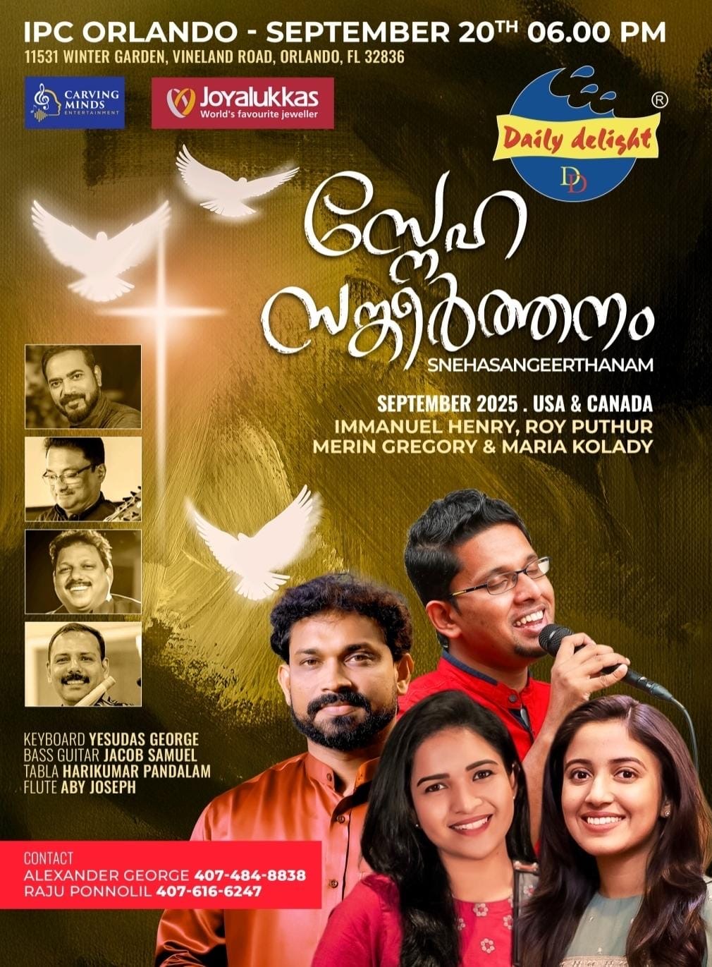 എക്കാലത്തെയും മികച്ച ഹൃദയ സ്പര്ശിയായ ക്രിസ്തീയ ഗാനങ്ങള് ആലപിക്കുവാന് അനുഗ്രഹീത ഗായികരായ മെറിൻ ഗ്രിഗറിയും, മരിയ കൊലാടിയും എത്തിച്ചേരും. യേശുദാസ് ജോർജ്, ഹരികുമാർ പന്തളം, ജേക്കബ് സാമുവേൽ, എബി ജോസഫ് എന്നിവരടങ്ങുന്ന ഓർക്കസ്ട്ര ടീം പരിപാടിയുടെ മാറ്റ് കൂട്ടും. ഫ്ലോറിഡയിൽ ഉള്ള ക്രൈസ്തവ സംഗീത പ്രേമികള്ക്ക് ഹൈ ക്വാളിറ്റി ഡിജിറ്റൽ സാങ്കേതിക വിദ്യയുടെ പിൻബലത്തിൽ വിവിധ ഭാഷകളിലുള്ള പഴയതും പുതിയതുമായ ഗാനങ്ങള് ശ്രവിക്കാവുന്നതാണ്.