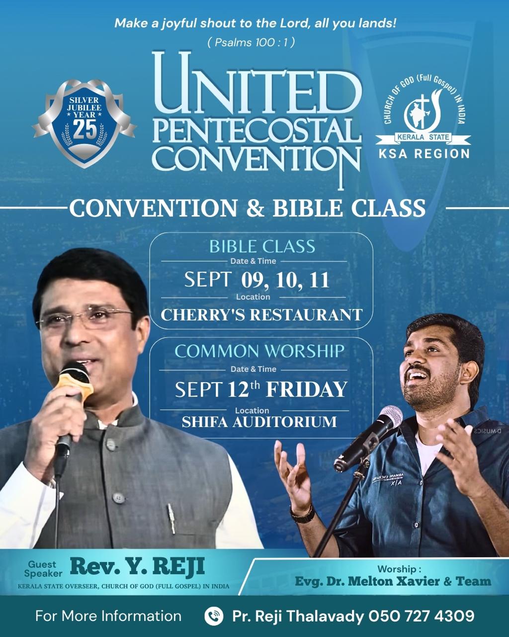 ബൈബിൾ ക്ലാസ് ദിവസവും വൈകിട്ട് 8.30 ന് ആരംഭിക്കും. റിയാദിലെ എല്ലാ പെന്തക്കോസ്ത് സഭകളെയും ചേർത്തുള്ള സംയുക്ത ആരാധന വെള്ളിയാഴ്ച രാവിലെ 9.30 ന് നടക്കും . റീജീണൽ പ്രസിഡണ്ട് പാ. റെജി തലവടി ശുശ്രൂഷകൾക്ക് നേതൃത്വം നൽകും.