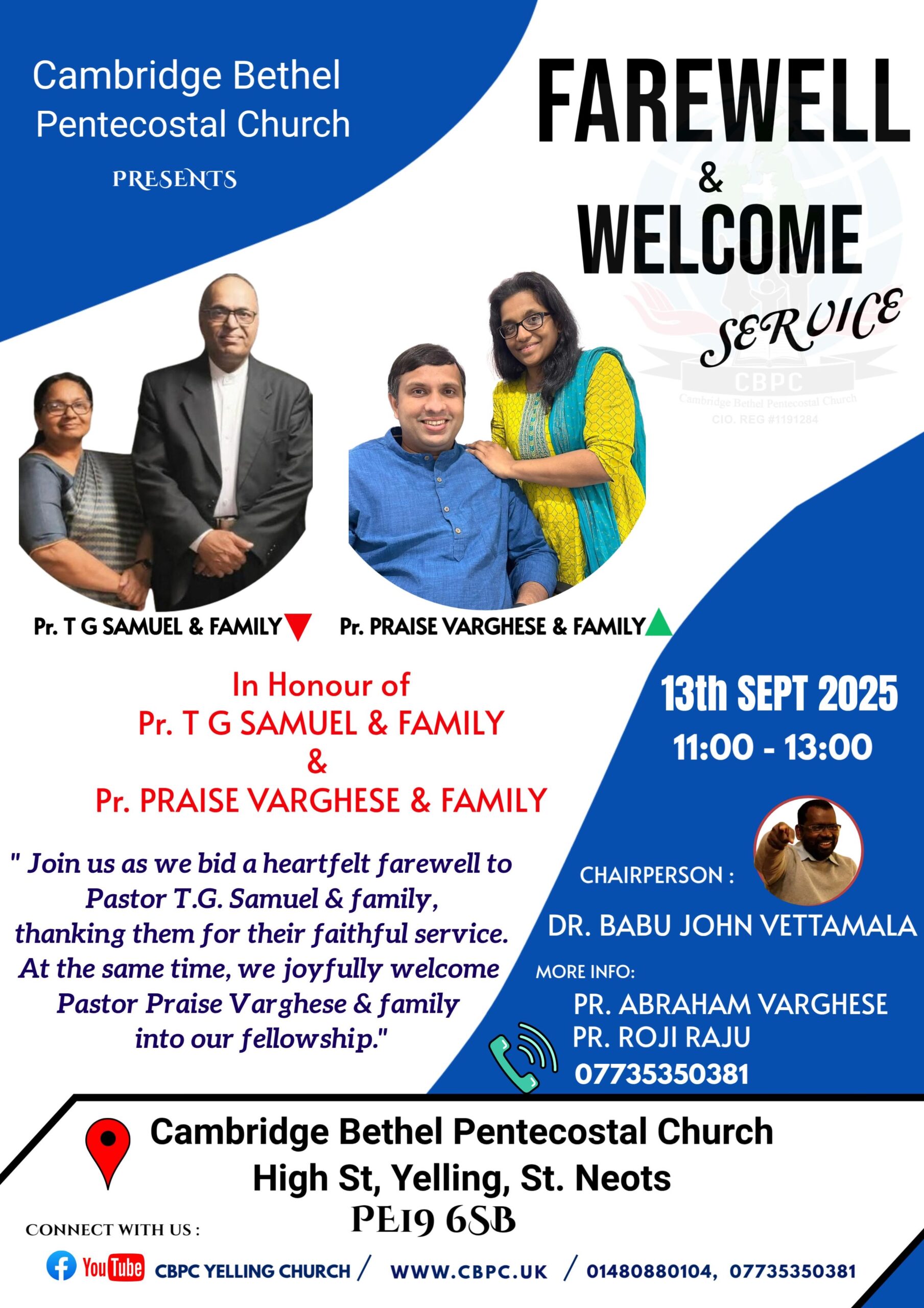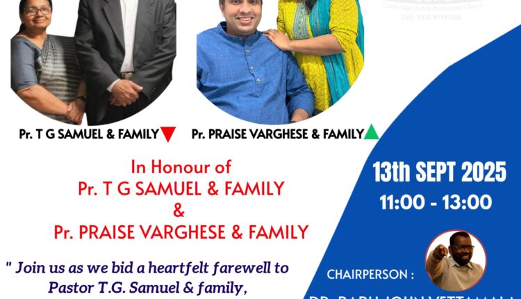 കേംബ്രിഡ്ജ് / (യു.കെ): കേംബ്രിഡ്ജ് ബെഥേൽ പെന്തെക്കൊസ്തൽ ചർച്ച് (സി.ബി.പി.സി) സീനിയർ പാസ്റ്ററായി 16 വർഷം ശുശ്രൂഷ ചെയ്ത പാസ്റ്റർ റ്റി.ജി സാമുവേലിന് യാത്രയപ്പും സഭയുടെ പുതിയ ശുശ്രൂഷകനായി പാസ്റ്റർ പ്രയ്സ് വർഗീസ് ചുമതലയേൽക്കുന്നതും സെപ്റ്റംബർ 13 ശനിയാഴ്ച രാവിലെ 11 മണിക്ക് St. Neots Yelling ഹൈ സ്ട്രീറ്റിലെ സി.ബി.പി.സി സഭ ഹാളിൽ (PE19 6SB) വെച്ച് നടക്കും.