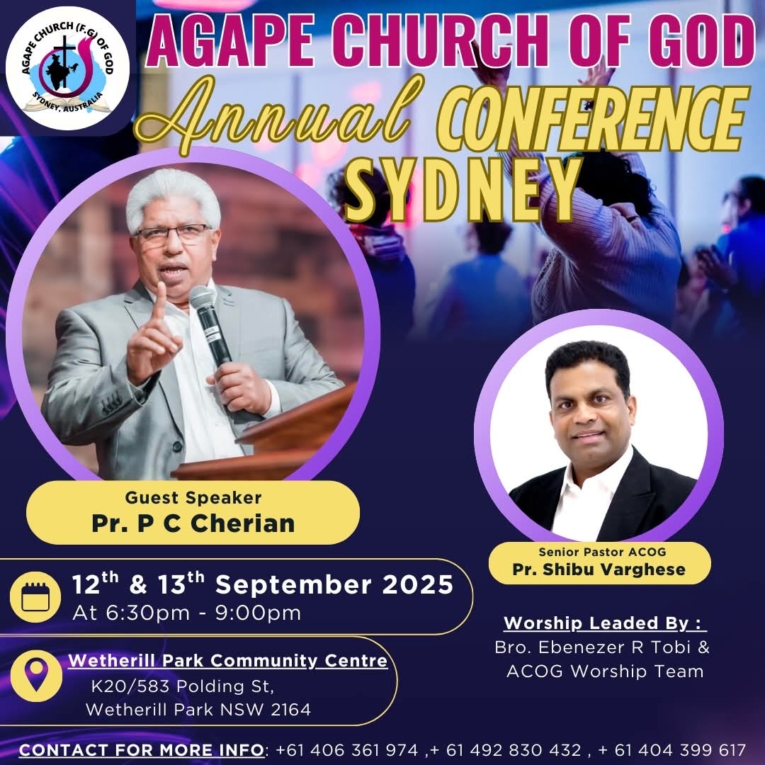 Sydney, Australia: The Agape Church of God (Full Gospel), Sydney, will host its Annual Conference on Friday, September 12th, and Saturday, September 13th, 2025. The event will be held from 6:30 pm to 9:00 pm each evening at the Wetherill Park Community Centre Conference Hall.