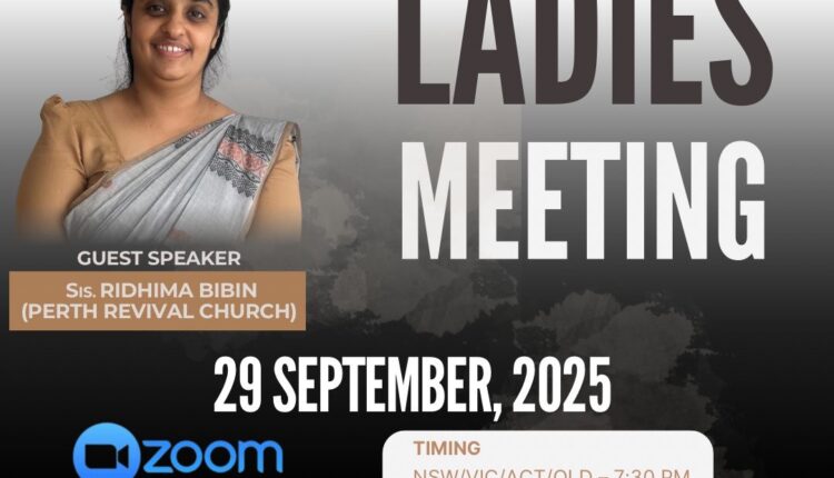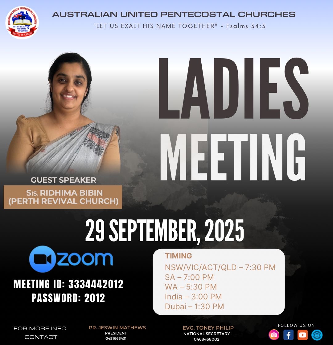 Australian United Pentecostal Churches (AUPC) conducting an online Ladies Meeting on 29th September 2025. This is a blessed opportunity for come together in fellowship, worship, and to receive a graceful message from God’s Word.