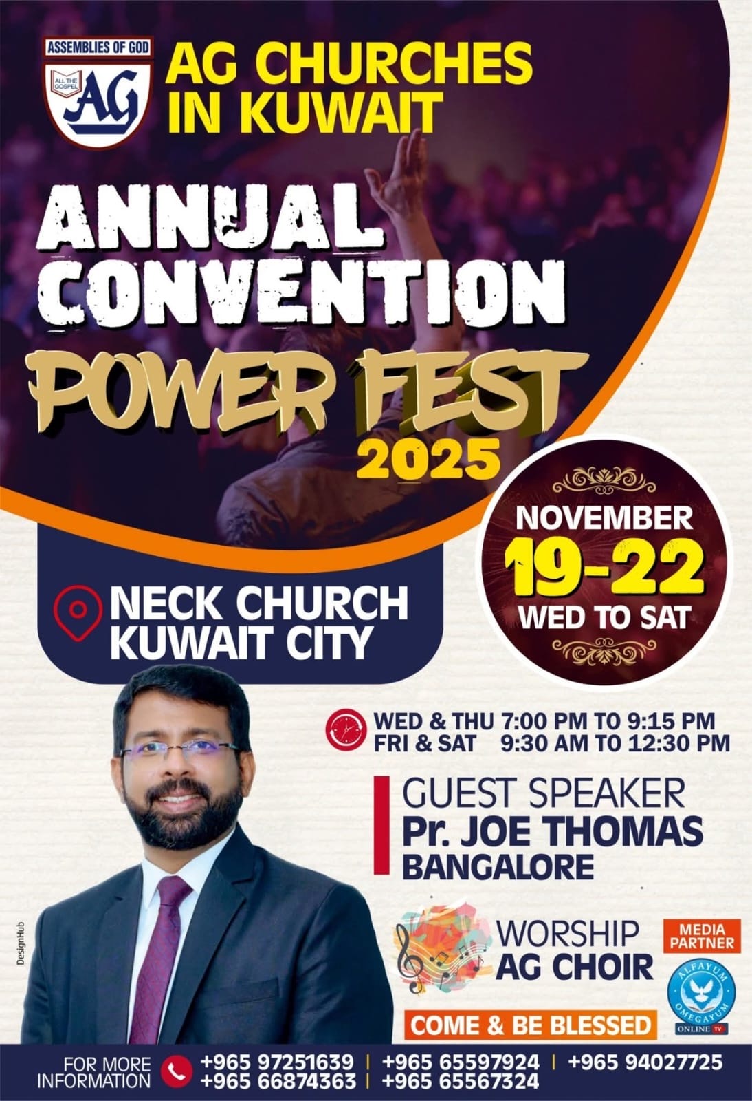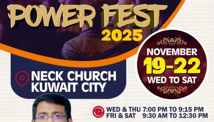 കുവൈറ്റ് സിറ്റി : അസംബ്ലിസ് ഓഫ് ഗോഡ് മലയാളം ഡിസ്ട്രിക്ട് കൗൺസിലിന്റെ കീഴിൽ പ്രവർത്തിക്കുന്നതും, കുവൈറ്റ് റ്റൗൺ മലയാളീ ക്രിസ്ത്യൻ കോൺഗ്രിഗേഷനോട് (കെ റ്റി എം സി സി) ചേർന്ന് പ്രവർത്തിക്കുന്നതുമായ കുവൈറ്റിലുള്ള അഞ്ച് അസംബ്ലിസ് ഓഫ് ഗോഡ് സഭകളായ ഫസ്റ്റ് അസംബ്ലി ഓഫ് ഗോഡ് ചർച്ച് കുവൈറ്റ്, അസംബ്ലിസ് ഓഫ് ഗോഡ് ചർച്ച് കുവൈറ്റ്, ബെഥേൽ അസംബ്ലിസ് ഓഫ് ഗോഡ് ചർച്ച്, ന്യൂ ലൈഫ് അസംബ്ലിസ് ഓഫ് ഗോഡ് ചർച്ച് മംഗഫ്, സയോൻ അസംബ്ലിസ് ഓഫ് ഗോഡ് ചർച്ച് മംഗഫ് എന്നീ സഭകളുടെ സംയുക്ത കൺവെൻഷൻ “പവ്വർ ഫെസ്റ്റ് 2025” & വിശുദ്ധ സഭാ ആരാധനയും ദൈവ ഹിതമായാൽ 2025 നവംബർ 19 ബുധൻ മുതൽ നവംബർ 22 ശനി വരെ കുവൈറ്റ് സിറ്റി നാഷണൽ ഇവാൻജെലിക്കൽ ചർച്ച് കോമ്പൗണ്ടിലെ ചർച്ച് & പാരിഷ് ഹാളിൽ വച്ച് എല്ലാ ദിവസവും വൈകിട്ട് 7 മണി മുതൽ 9 മണി വരെ നടക്കും.