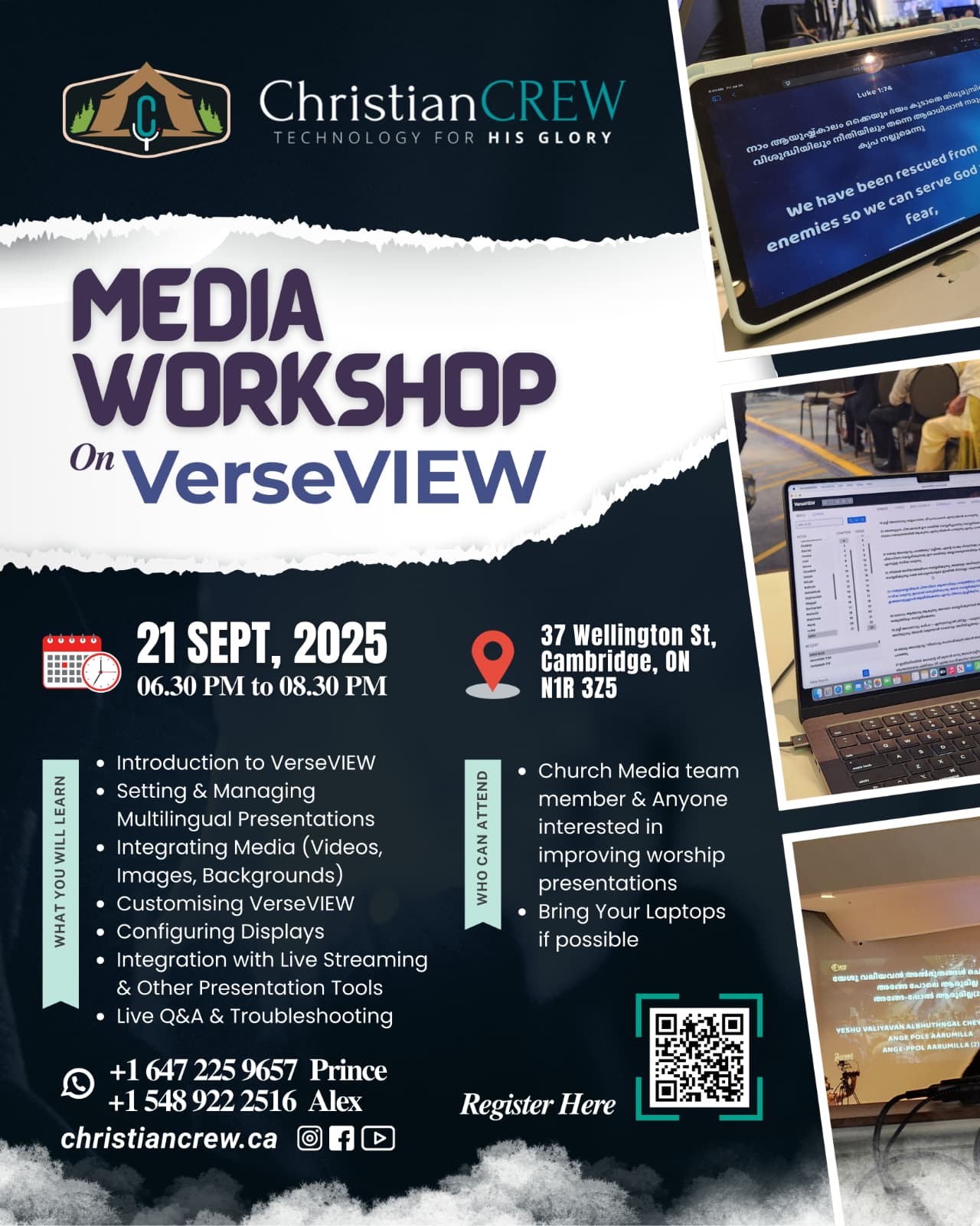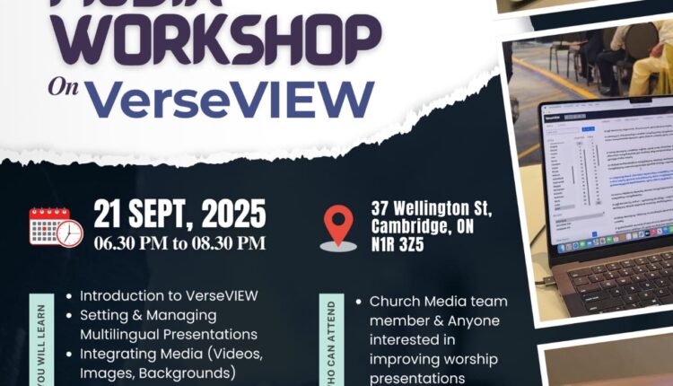 കിച്ചണർ/കാനഡ: വിവിധ ക്രൈസ്തവ സഭകളിലെ മീഡിയ ടീമുകളുടെ കൂട്ടായ്മയായ ക്രിസ്റ്റ്യൻ ക്രൂ സംഘടിപ്പിക്കുന്ന വേഴ്സ്-വ്യൂ ശില്പശാല സെപ്റ്റംബർ 21ന് 6.30 മുതൽ 8.30 വരെ കിച്ചണറിൽ നടത്തപ്പെടും. (37 Wellington St, Cambridge, ON) വിവിധ സഭകളിലെ മീഡിയ ടീം അംഗങ്ങൾക്കും വേഴ്സ്-വ്യൂ സോഫ്റ്റ് വെയർ പഠിക്കാൻ താല്പര്യമുള്ളവർക്കും ഈ ശില്പശാലയിൽ പങ്കെടുക്കാം.