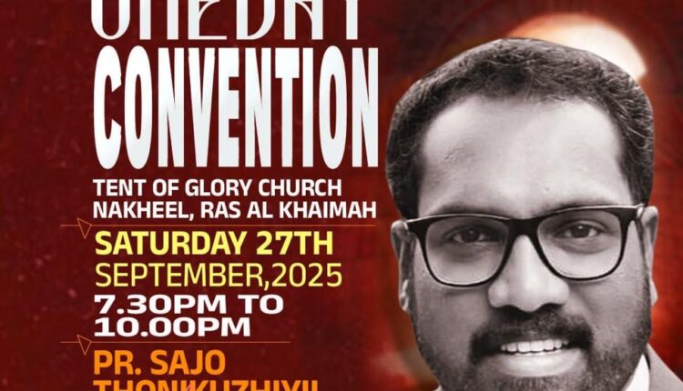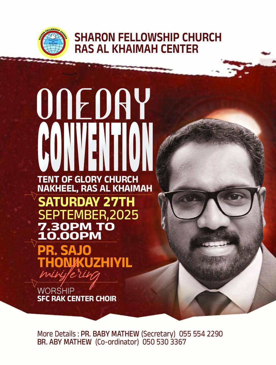റാസ് അൽ ഖൈമ – ശാരോൺ ഫെലോഷിപ്പ് ചർച്ച റാസൽഖൈമ സെന്ററിന്റെ നേതൃത്വത്തിൽ നടത്തുന്ന ഏക ദിന കൺവെൻഷൻ സെപ്റ്റംബർ 27 ശനിയാഴ്ച വൈകുന്നേരം 7 30 മുതൽ 10 :30 വരെ റാസ് -അൽ -ഖൈമ, ടെന്റ് ഓഫ് ഗ്ലോറി ചർച്ചിൽ വച്ച് നടക്കും. ഈ കാലഘട്ടത്തിൽ കർത്രു കരങ്ങളിൽ പ്രയോജപ്പെട്ടു കൊണ്ടിരിക്കുന്ന അനുഗ്രഹീത പ്രഭാഷകൻ പാസ്റ്റർ: സാജോ തോണിക്കുഴിയിൽ മുഖ്യ സന്ദേശം നൽകും. എസ്. എഫ് സി, റാസൽഖൈമ സെന്റർ ക്വയർ ഗാനസുശ്രൂഷയ്ക്ക് നേതൃത്വം നൽകും.സെൻട്രൽ മിനിസ്റ്റർ: പാസ്റ്റർ ഗിൽബർട്ട് ജോർജ്, സെന്റർ സെക്രട്ടറി :പാസ്റ്റർ ബേബി മാത്യു എന്നിവർ ശുശ്രൂഷകൾക്ക് നേതൃത്വം നൽകും