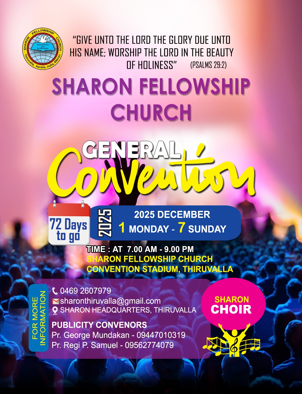 തിരുവല്ല : ശാരോൻ ഫെലോഷിപ്പ് സഭകളുടെ അന്തർദേശീയ ജനറൽ കൺവൻഷൻ 2025 ഡിസംബർ 1 തിങ്കൾ മുതൽ 7 ഞായർ വരെ തിരുവല്ല ശാരോൻ കൺവൻഷൻ സ്റ്റേഡിയത്തിൽ നടക്കും. ആത്മനിറവും വചന പരിജ്ഞാനവും ഉള്ള ദൈവദാസന്മാർ വചന പ്രഭാഷണം നടത്തും കൺവൻഷനോടനുബന്ധിച്ച് പാസ്റ്റേഴ്സ് കോൺഫ്രൻസ് , ബൈബിൾ സ്റ്റഡി , പൊതുയോഗം, മിഷൻ സമ്മേളനം , ധ്യാനയോഗം, സ്നാനശുശ്രൂഷ, പൊതുസഭായോഗം, കർത്തൃമേശാ ശുശ്രൂഷയും നടത്തപ്പെടും. ശാരോൻ ക്വയർ ഗാന ശുശ്രൂഷകൾക്ക് നേതൃത്വം നല്കും . കൺവൻഷൻ്റെ സുഗമമായ നടത്തിപ്പിനു വേണ്ടി പൊതുസഭാ മണ്ഡലം കൂടി വിവിധ സബ് കമ്മറ്റികളെ തെരഞ്ഞെടുത്തു.