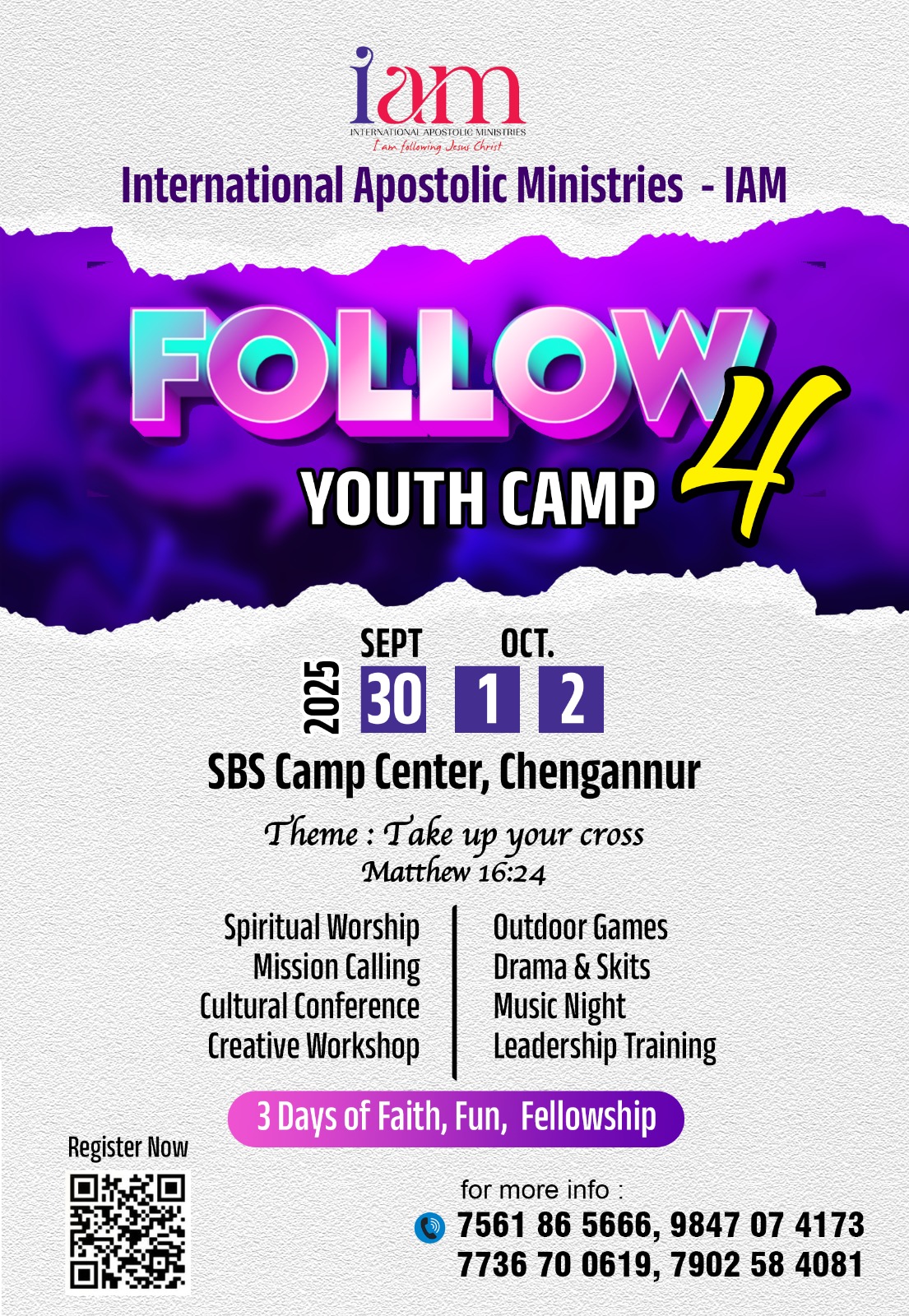 ഇന്റർനാഷണൽ അപ്പോസ്തോലിക് മിനിസിട്രിസ് (IAM)ന്റെ നേതൃത്വത്തിൽ നടക്കുന്ന FOLLOW 4 യൂത്ത് ക്യാമ്പ് 2025 സെപ്റ്റംബർ 30,ഒക്ടോബർ 1,2 തീയതികളിൽ ചെങ്ങന്നൂർ SBS ക്യാമ്പ് സെന്ററിൽ വെച്ചു നടക്കും.’ Take up your cross’ എന്നത് ആണ് ‘ക്യാമ്പിന്റെ തീം. റെവ. എ ജെ നോബിൾ ഉത്ഘാടനം ചെയ്യുന്ന ക്യാമ്പിൽ ടിബിൻ തങ്കച്ചൻ, അബി ആൻഡ്രൂസ്, ആദർശ് എസ് എന്നിവർ സംഗീത ശുശ്രൂഷക്ക് നേതൃത്വം നൽകും.