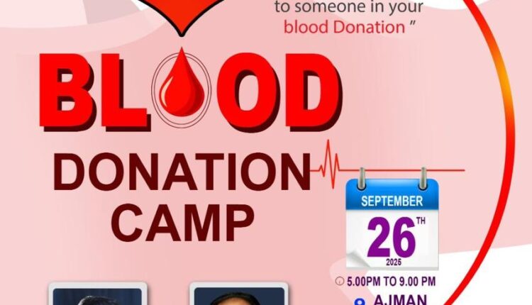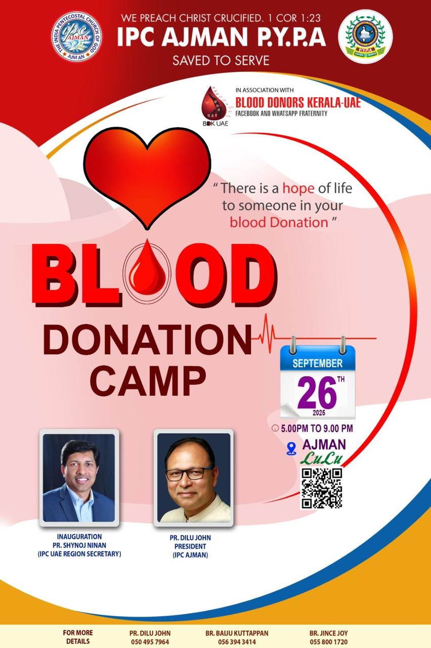 യൂഎഇ : അജ്മാൻ ഐ പി സി , പി വൈ പി എ ബ്ലഡ് ഡോണേഴ്സ് കേരളയും ആയി ചേർന്ന് ക്രമീകരിക്കുന്ന ബ്ലഡ് ഡൊണേഷൻ ക്യാമ്പ് ഈ വരുന്ന വെള്ളിയാഴ്ച 26/9/2025 വൈകിട്ട് 5 മണി മുതൽ രാത്രി 9 മണി വരെ അജ്മാൻ ലുലു സെൻററിന്റെ സമീപം ഉള്ള ആർ ടി എ പാർക്കിംഗ് ഏരിയയിൽ വെച്ച് നടത്തപ്പെടുന്നു രക്തദാനത്തിന്റെ മാഹാത്മ്യം മനസ്സിലാക്കി എല്ലാ പ്രിയപ്പെട്ടവരും കടന്ന് വരണം എന്ന് അഭ്യർഥിക്കുന്നു