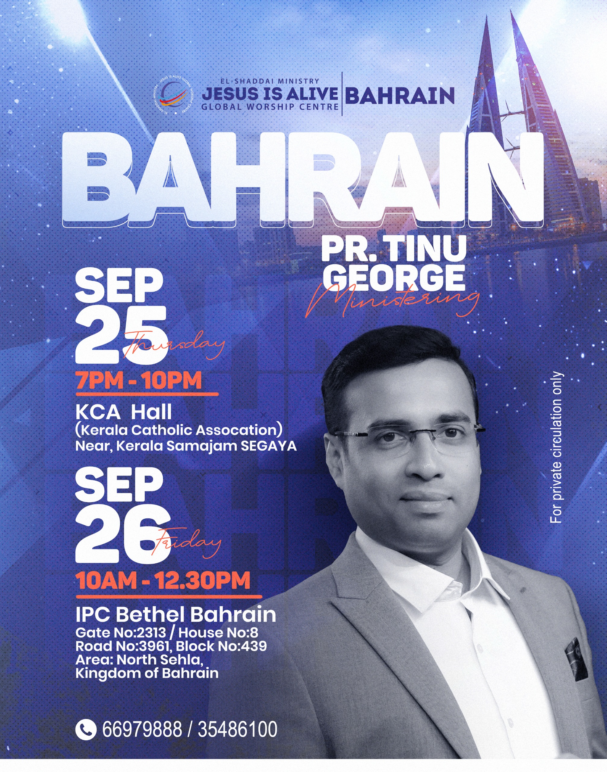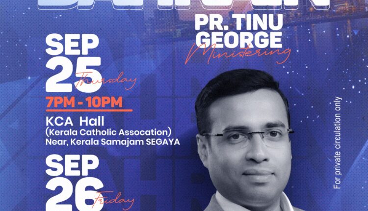 ബഹ്റൈൻ : ജീസസ് ഈസ് എലൈവ് ഗ്ലോബൽ വർഷിപ്പ് സെൻറർ ചർച്ചുകളുടെ സീനിയർ പാസ്റ്ററും എൽ- ഷദ്ദായി മിനിസ്റ്റിറിയുടെ ചെയർമാനുമായ പാസ്റ്റർ ടിനു ജോർജ് ബഹറിനിൽ ദൈവവചനം പ്രസംഗിക്കുന്നു. ജീസസ് ഈസ് എ ലൈവ് ഗ്ലോബൽ വർഷിപ്പ് സെൻറർ ബഹറിൻ ചർച്ചിൻ്റെ ആഭിമുഖ്യത്തിൽ 25/09/2025 വ്യാഴാഴ്ച 7 PM മുതൽ 10 PM വരെ KCA ഹാളിലും (Kerala Catholic Association Hall Near Kerala Samajam SEGAYA) 26/09/2025 വെള്ളിയാഴ്ച 10 AM മുതൽ 12.30 PM വരെ IPC Bethel Bahrain (Gate No2313/House No:8,Road No:3961,Block No:439,Area,North Sehla, Kingdom Of Bahrain ) എന്ന സ്ഥലത്തു വച്ചും വിടുതലിൻ ശുശ്രൂഷകൾ നടക്കുന്നു. കൂടുതൽ വിവരങ്ങൾക്കായി 66979888/35486100 ബന്ധപ്പെടുക