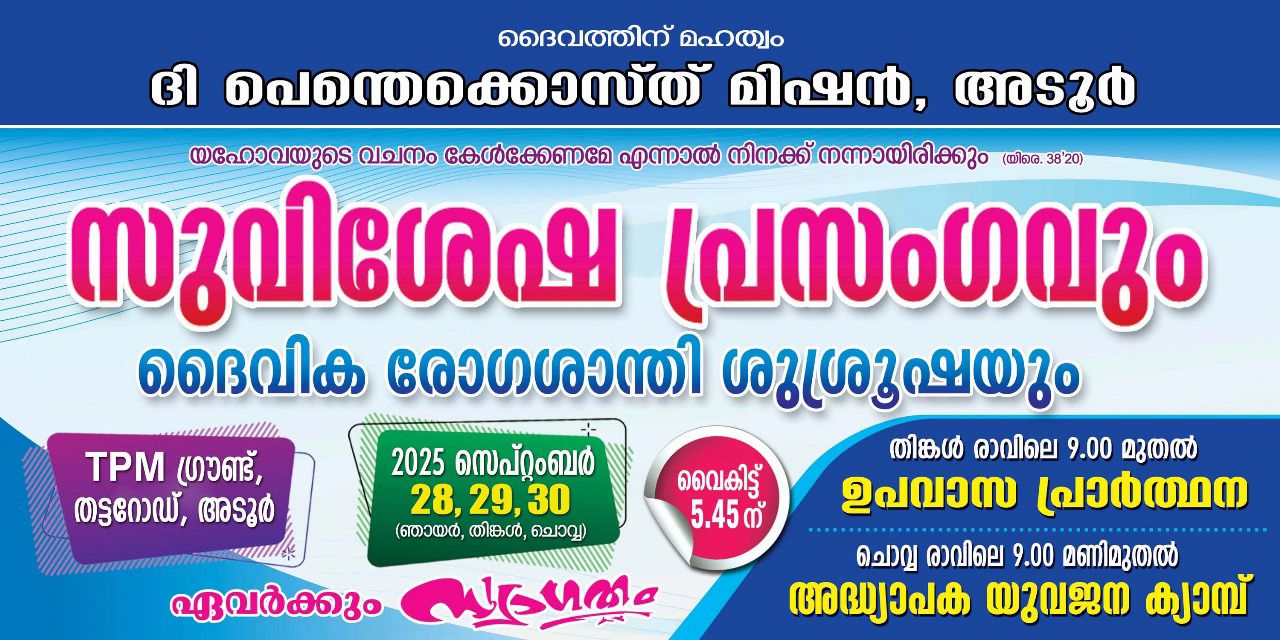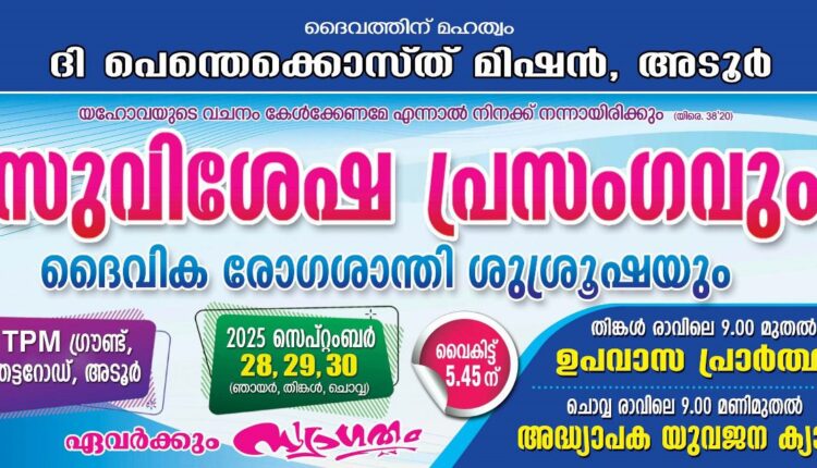 അടൂർ: ദി പെന്തെക്കൊസ്ത് മിഷൻ അടൂർ സഭയുടെ (കൊട്ടാരക്കര സെന്റർ) ആഭിമുഖ്യത്തിൽ സുവിശേഷ പ്രസംഗം സെപ്റ്റംബർ 28, 29, 30 തീയതികളിൽ തട്ടറോഡിലെ റ്റി.പി.എം ഗ്രൗണ്ടിൽ നടക്കും.