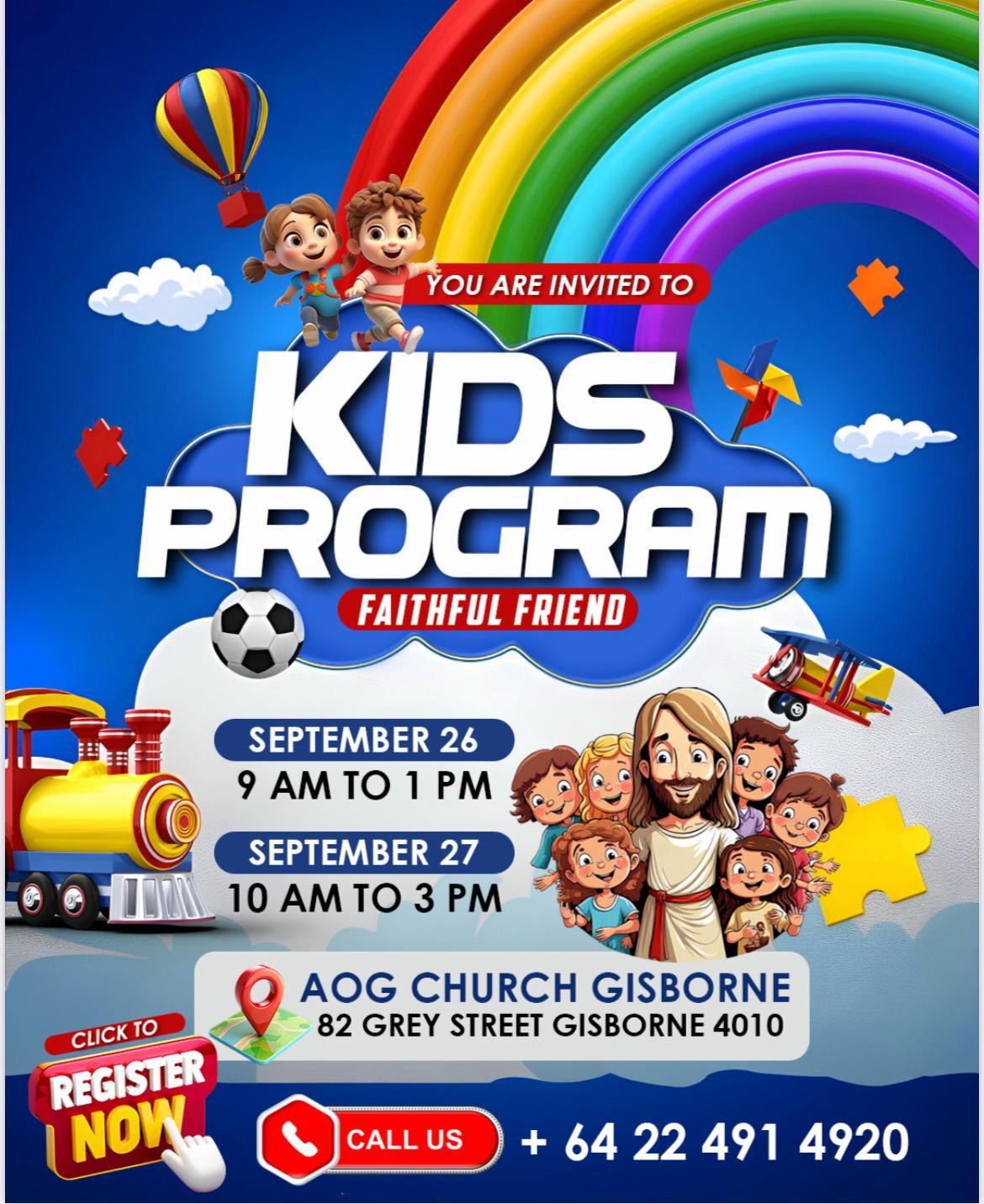 ന്യൂസിലൻഡ്: എ ഓ ജി ചർച്ച് ജിസ്ബോർണ് റീജിയണിൻ്റെ ആഭിമുഖ്യത്തിൽ “കിഡ്സ് പ്രോഗ്രാം” നടത്തുന്നു. 2025 സെപ്റ്റംബർ 26, 27 തീയതികളിൽ എ ഓ ജി ചർച്ച്, ജിസ്ബോർണ് ചർച്ച് ഹാളിൽ വെച്ചാണ് നടത്തപ്പെടുന്നത്. എല്ലാദിവസവും രാവിലെ 9 മണി മുതൽ ഉച്ചയ്ക്ക് 1 മണി വരെയാണ് പ്രോഗ്രാം. “ഫൈത്ഫുൾ ഫ്രെണ്ട്” എന്നതാണ് തീം ആയി തിരഞ്ഞെടുത്തിരിക്കുന്നത്. വിവിധ ഏരിയകളിൽ നിന്നുള്ള കുട്ടികൾ ഇതിൽ പങ്കെടുക്കും എന്ന സംഘടകർ അറിയിച്ചു.