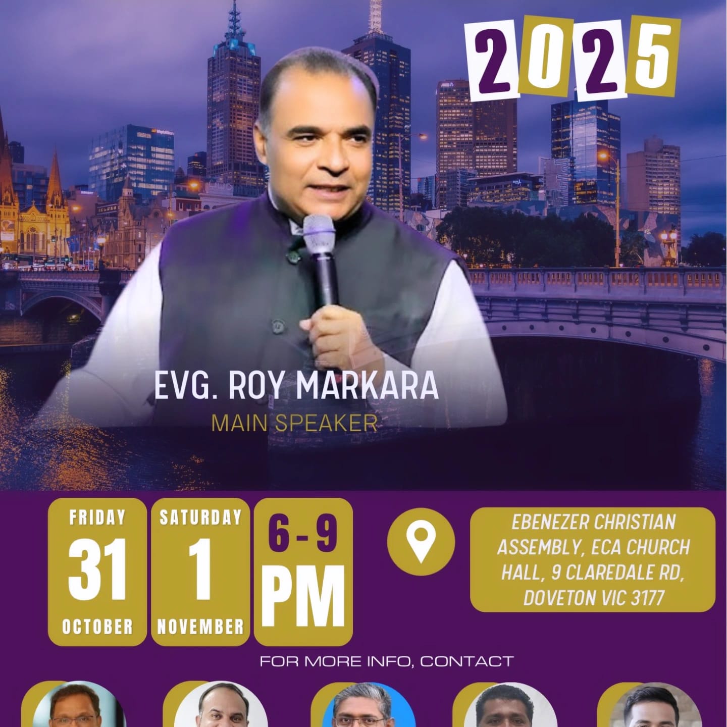 The powerful Word of God will be delivered by Evangelist Roy Markara, a globally anointed servant of God who has ministered in over 40 nations. His deep burden for souls and mission work has led thousands into the saving knowledge of Jesus Christ. He has previously ministered in major global gatherings where the Holy Spirit moved powerfully, touching hundreds of hearts. We believe the Lord has appointed this time to bring deliverance and renewal through His servant, here in Australia. Let us gather in one accord to seek the face of our Lord and Savior Jesus Christ.