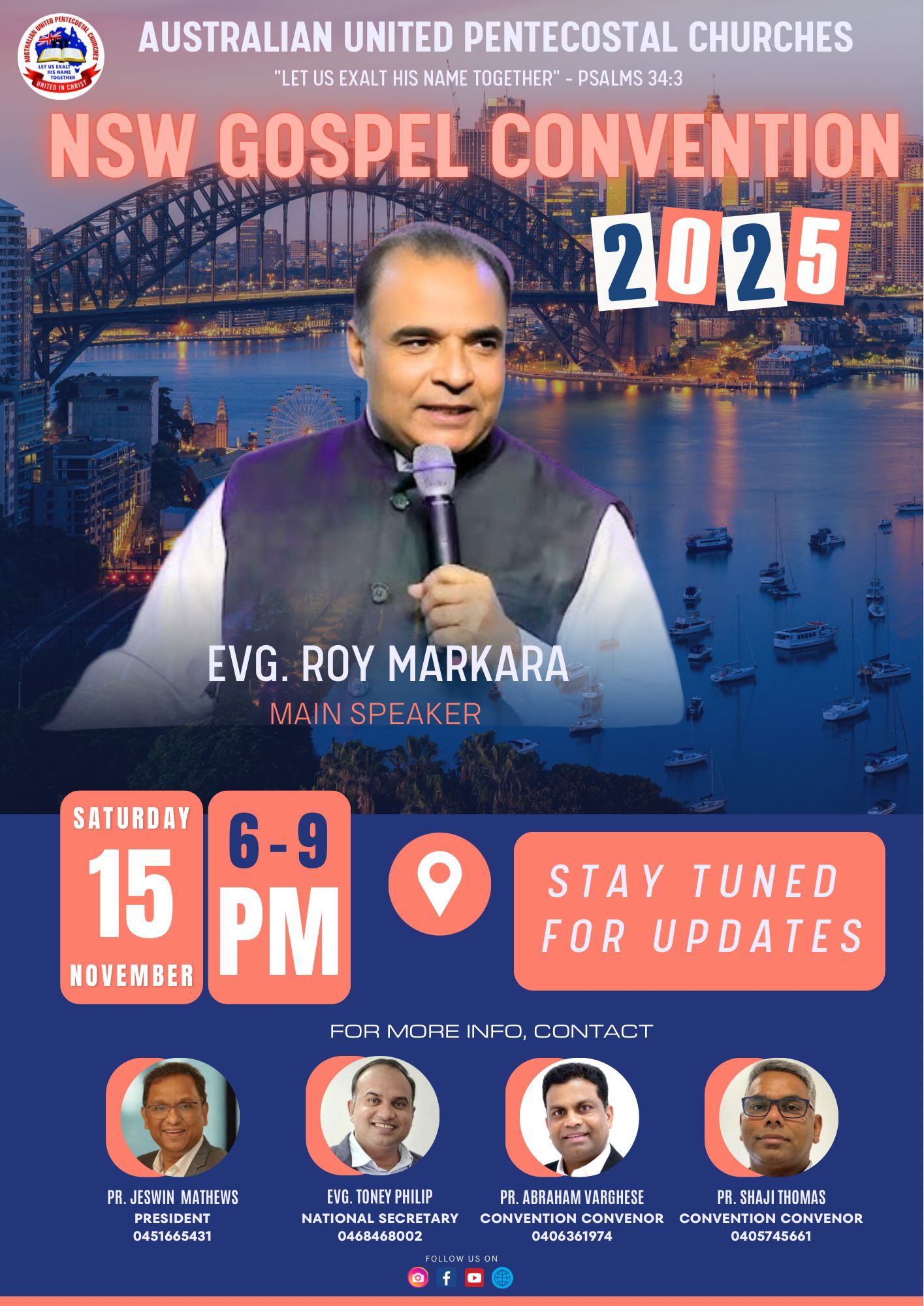 Australian United Pentecostal Churches (AUPC) is conducting an NSW State Gospel Convention 2025 on Saturday, 15th November 2025, from 6:00 PM to 9:00 PM. It will be a major gathering of Pentecostal believers from across the state and Youth Conference will be conducted on the same day from 2:00 PM to 5:00 PM. This state-wide gospel convention aims to prepare hearts and minds for the end times and the second coming of Jesus Christ, bringing together Christians in prayer, worship, and the ministry of the Word. The main speaker will be Evangelist Roy Markara, a missionary who has tirelessly worked across 40 countries, spreading the gospel and strengthening churches worldwide. His message is expected to be a powerful call to revival and readiness in light of biblical revelation. Adding to the spiritual impact of the event, a well-known worship leader will lead the congregation in heartfelt praise and worship, creating an atmosphere of unity and divine encounter. For more information, contact the organisers listed on the official flyer.