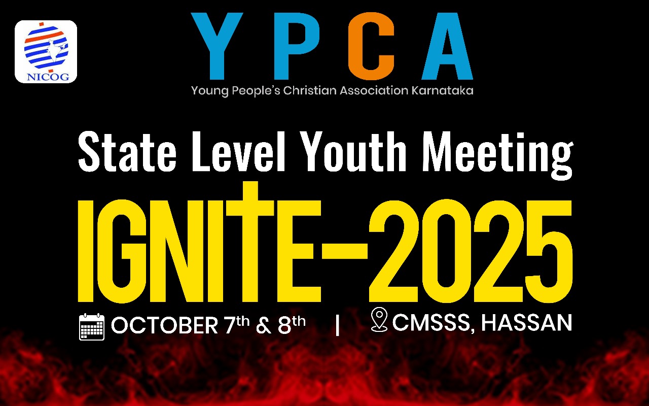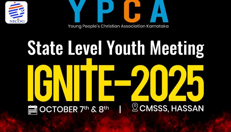 ബെംഗളൂരു: ന്യൂ ഇന്ത്യ ചർച്ച് ഓഫ് ഗോഡ് കർണാടക സ്റ്റേറ്റ് യുവജന വിഭാഗമായ വൈ.പി.സി.എ ( യങ് പീപ്പിൾസ് ക്രിസ്ത്യൻ അസോസിയേഷൻ) കർണാടക യുവജനസമ്മേളനം ഇഗ്നൈറ്റ് ഒക്ടോ.7 , 8 തീയതികളിൽ ഹാസൻ സി.എം.എസ്.എസ്.എസ് ഹാളിൽ നടക്കും. എൻ.ഐ.സി.ഒ.ജി കർണാടക സ്റ്റേറ്റ് പ്രസിഡൻ്റ് പാസ്റ്റർ നൂറുദ്ദിൻ മുള്ള സമ്മേളനം ഉദ്ഘാടനം ചെയ്യും. ബ്രദർ. സി.ഒ.വർഗീസ്, ബ്രദർ. ജോയൽ സാം തോമസ്, ഡോ.ലിസബേത്ത് ജോയൽ എന്നിവർ വിവിധ സെഷനുകളിൽ പ്രസംഗിക്കും. സമ്മേളനത്തിൽ ഗാനശുശ്രൂഷ, കൗൺസിലിംങ്ങ് തുടങ്ങീ വിവിധ പരിപാടികൾ നടക്കും. മംഗളൂരു, ഹാസൻ ,ചിക്കമംഗളൂരു, മൈസൂരു, ബെൽഗാം, ബെംഗളൂരു തുടങ്ങിയ വിവിധ റീജിയണിലെ യുവതി യുവാക്കൾ പരിപാടിയിൽ പങ്കെടുക്കും. വൈ.പി.സി.എ പ്രസിഡൻ്റ് പാസ്റ്റർ .ചാൾസ് ജോസഫ് (ബെൽഗാം ), സെക്രട്ടറി പാസ്റ്റർ.റോയ് ജോർജ് (ബെംഗളൂരു ) എന്നിവർ നേതൃത്വം നൽകും.