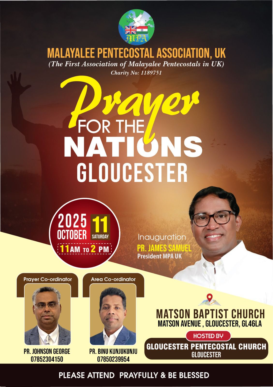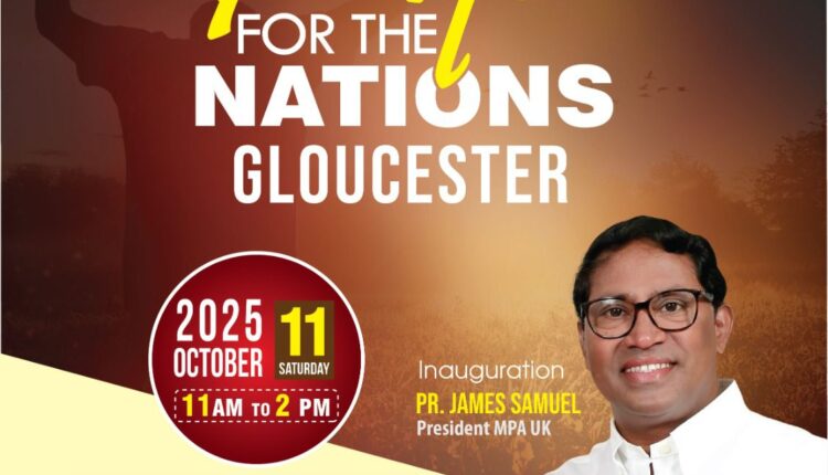 ഇംഗ്ലണ്ട്: എം.പി.എ യു.കെയുടെ ആഭിമുഖ്യത്തിൽ രാജ്യത്തിന്റെ ഉണർവ്വിനായി ഇംഗ്ലണ്ടിലെ വിവിധ പട്ടണങ്ങളിൽ വെച്ച് നടത്തപ്പടുന്ന ഏകദിന പ്രാർത്ഥനാ സംഗമം 2025 ഒക്ടോബർ 𝟏𝟏ന് ശനിയാഴ്ച രാവിലെ 11:00 മണി മുതൽ ഉച്ചക്ക് 2 മണിവരെ ഗ്ലൗസെസ്റ്റർ പെന്തക്കോസ്തൽ ചർച്ചിന്റെ ആഭിമുഖത്തിൽ ഗ്ലൗസെസ്റ്റർ പട്ടണത്തിൽ വെച്ചു നടക്കും.