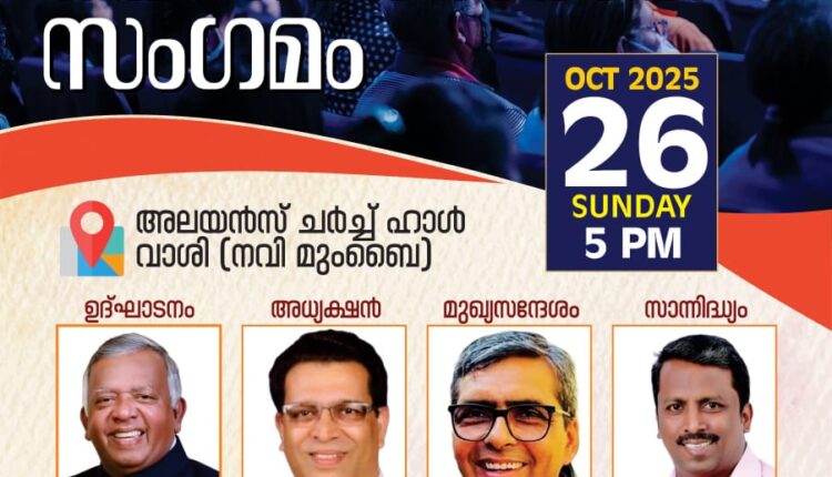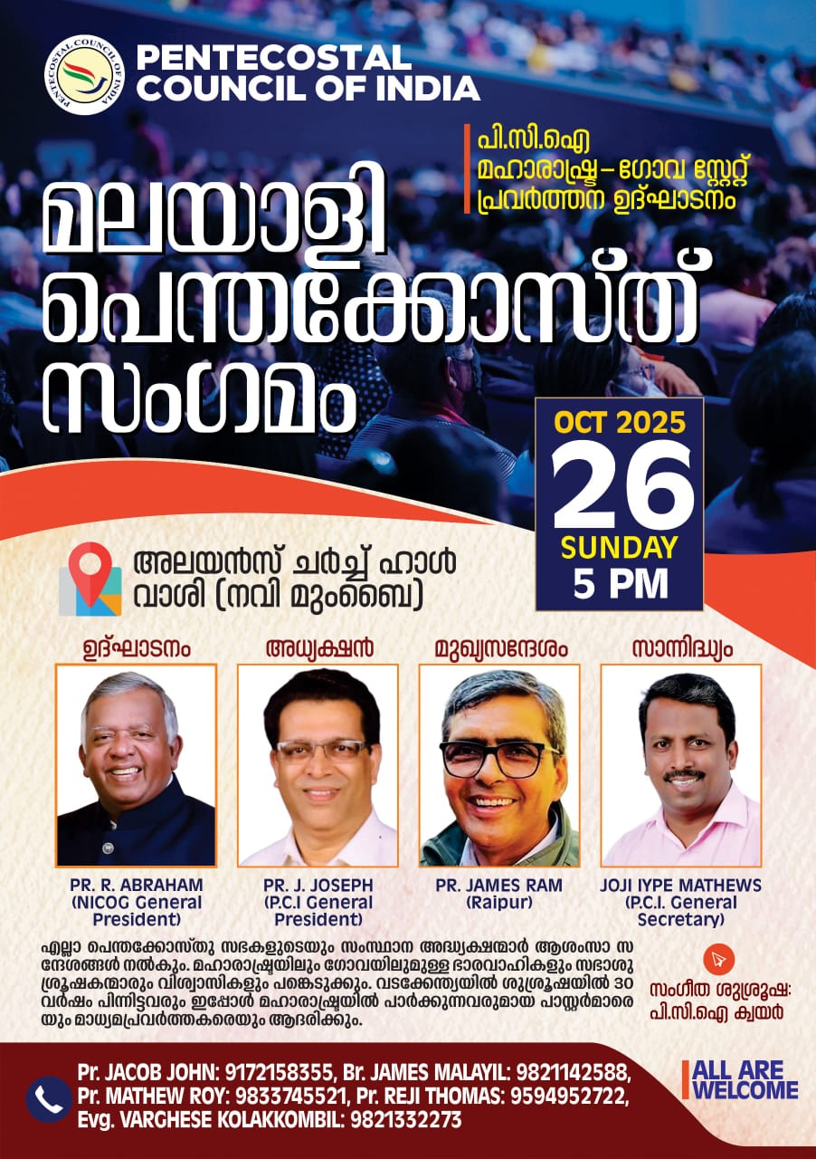 മുംബൈ: പെന്തക്കോസ്തൽ കൗൺസിൽ ഓഫ് ഇന്ത്യയുടെ ആഭിമുഖ്യത്തിൽ മഹാരാഷ്ട്ര ഗോവ മേഖലകളിലെ വിശ്വാസ സമൂഹത്തെ അണിനിരത്തി ഒക്ടോബർ 26 ഞായർ വൈകിട്ട് അഞ്ചിന് നവി മുംബൈ വാശി അലയൻസ് ചർച്ച് ഓഡിറ്റോറിയത്തിൽ മലയാളി പെന്തക്കോസ്ത് സംഗമവും പി.സി.ഐ സംസ്ഥാന പ്രവർത്തന ഉദ്ഘാടനവും നടക്കും. പി.സി.ഐ ജനറൽ പ്രസിഡണ്ട് പാസ്റ്റർ ജെ ജോസഫ് അധ്യക്ഷത വഹിക്കുന്ന സമ്മേളനം ന്യു ഇന്ത്യാ ചർച്ച് ഓഫ് ഗോഡ് ജനറൽ പ്രസിഡണ്ട് പാസ്റ്റർ ആർ ഏബ്രഹാം ഉദ്ഘാടനം ചെയ്യും. പാസ്റ്റർ ജെയിംസ് റാം (റായ്പൂർ ) മുഖ്യപ്രഭാഷണം നടത്തും.