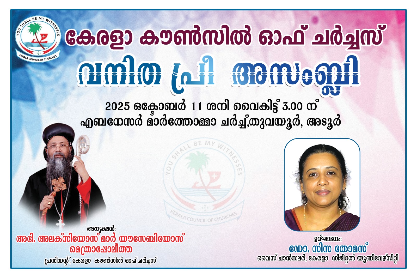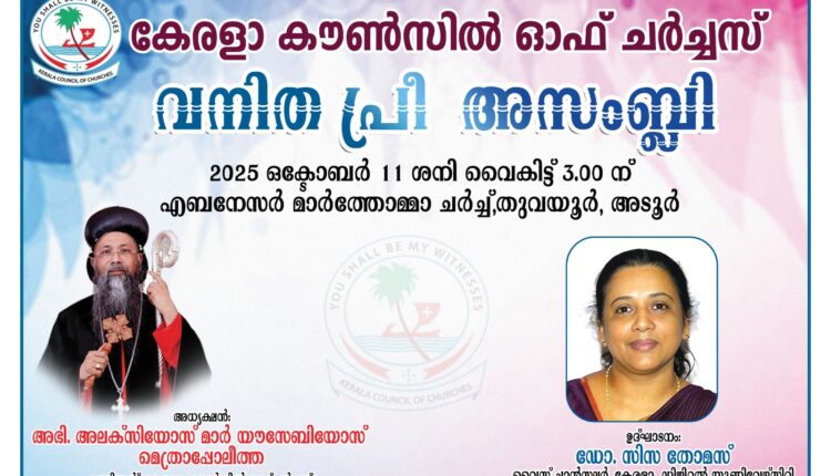 അടൂർ: കേരള കൗൺസിൽ ഓഫ് ചർച്ചസ് (കെസിസി)സംസ്ഥാന വാർഷിക അസംബ്ലിക്ക് മുന്നോടിയായി നടത്തുന്ന വനിത പ്രീ അസംബ്ലി ഒക്ടോബർ 11 ശനി വൈകിട്ട് 3 മണിക്ക് അടൂർ തുവയൂർ എബനേസർ മാർത്തോമ്മാ പള്ളിയിൽ നടക്കും. കെസിസി പ്രസിഡൻ്റ് അലക്സിയോസ് മാർ യൗസേബിയോസ് മെത്രാപ്പോലീത്ത അധ്യക്ഷത വഹിക്കുന്ന സമ്മേളനം കേരളാ ഡിജിറ്റൽ യൂണിവേഴ്സിറ്റി വൈസ് ചാൻസലർ ഡോ. സിസ തോമസ് ഉദ്ഘാടനം ചെയ്യും. കെസിസി ജനറൽ സെക്രട്ടറി ഡോ.പ്രകാശ് പി.തോമസ്, കെസിസി വനിത കമ്മീഷൻ ചെയർപേഴ്സൺ ധന്യ ജോസ് എന്നിവർ വിഷയാവതരണം നടത്തും.