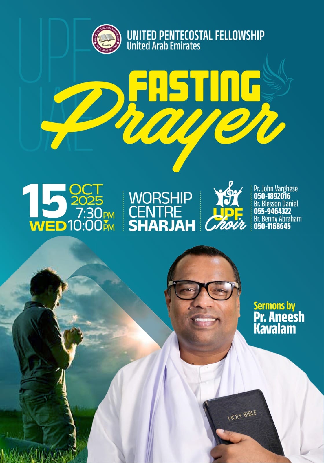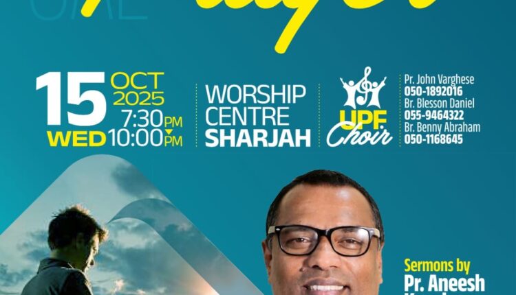 ഷാർജ: യുണൈറ്റഡ് പെന്തെക്കോസ്തൽ ഫെല്ലോഷിപ് (യു പി എഫ് ) യു എ ഇ യുടെ ആഭിമുഖ്യത്തിൽ നടക്കുന്ന ഉപവാസ പ്രാർത്ഥനയിൽ ഇന്ന് വൈകിട്ട് 7.30ന് ഷാർജ വർഷിപ് സെന്ററിൽ പാസ്റ്റർ അനീഷ് കാവാലം പ്രസംഗിക്കുന്നു. യു പി എഫ് ക്വയർ ഗാനങ്ങൾ ആലപിക്കും. പാസ്റ്റർ ജോൺ വർഗീസ്, ബ്രദർ ബ്ലസ്സൻ ഡാനിയേൽ, ബ്രദർ ബെന്നി എബ്രഹാം തുടങ്ങിയവർ നേതൃത്വം നൽകും.