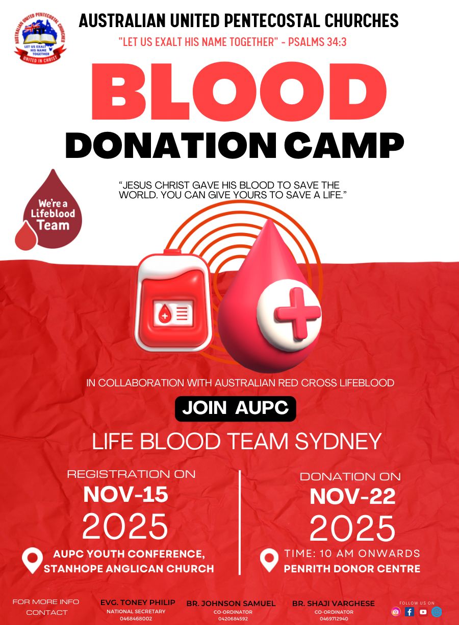 Australia: Australian United Pentecostal Churches (AUPC) proudly announces another meaningful step in charity and compassion. AUPC Blood Donation Camp 2025, in collaboration with the Australian Red Cross Lifeblood. This life-saving initiative reminds us that “Jesus Christ gave His blood to save the world. You can give yours to save a life.” Registration Day: 15th November 2025, during the AUPC Youth Conference at Stanhope Anglican Church. First Donation Day: 22nd November 2025, at Penrith Donor Centre, starting from 10 AM onwards. Through this initiative, all interested participants will be registered in the AUPC Lifeblood Database, enabling the organization to conduct blood donation programs regularly as part of its ongoing commitment to serve the community. AUPC has already established similar Blood Donation Camps in Melbourne, Brisbane, and Perth, in collaboration with the Australian Lifeblood Team, with official announcements for these states coming soon. Let us come together to share the gift of life and demonstrate the love of Christ through our actions. We welcome Youth from all churches in Sydney to hand together for this great initiative.