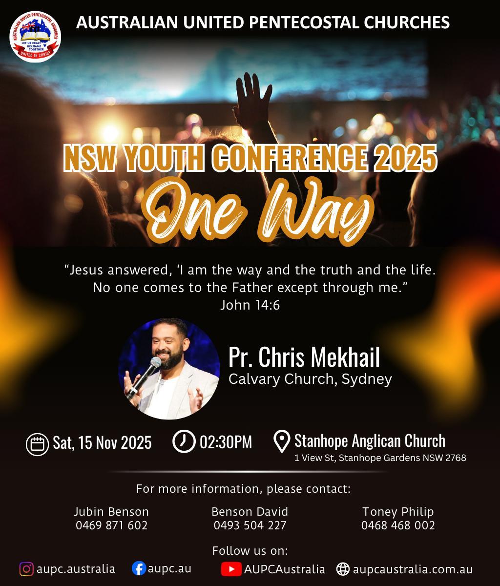 Sydney: Australian United Pentecostal Churches (AUPC) is once again bringing the fire of awakening to Sydney with the NSW Youth Conference 2025, set for Saturday, 15 November 2025 at 3:00 PM at Stanhope Anglican Church, Stanhope Gardens, NSW. The countdown is on for one of the most anticipated youth events of the year. With the theme “One Way”, drawn from John 14:6 “Jesus answered, ‘I am the way and the truth and the life. No one comes to the father except through me’” this conference is a call to clarity, conviction, and commitment. Pastor Chris Mekhail from Calvary Church, Sydney, whose dynamic preaching and passion for youth ministry have inspired countless young hearts. His message will focus on the exclusive and transformative path of Jesus Christ. “the way, the truth, and the life.” Whether you’re a seasoned believer or just exploring faith, NSW Youth Conference 2025 is your invitation to discover the “One Way” that leads to truth, life, and purpose. We welcome all youth and adults from Sydney churches and beyond to gather and worship God.