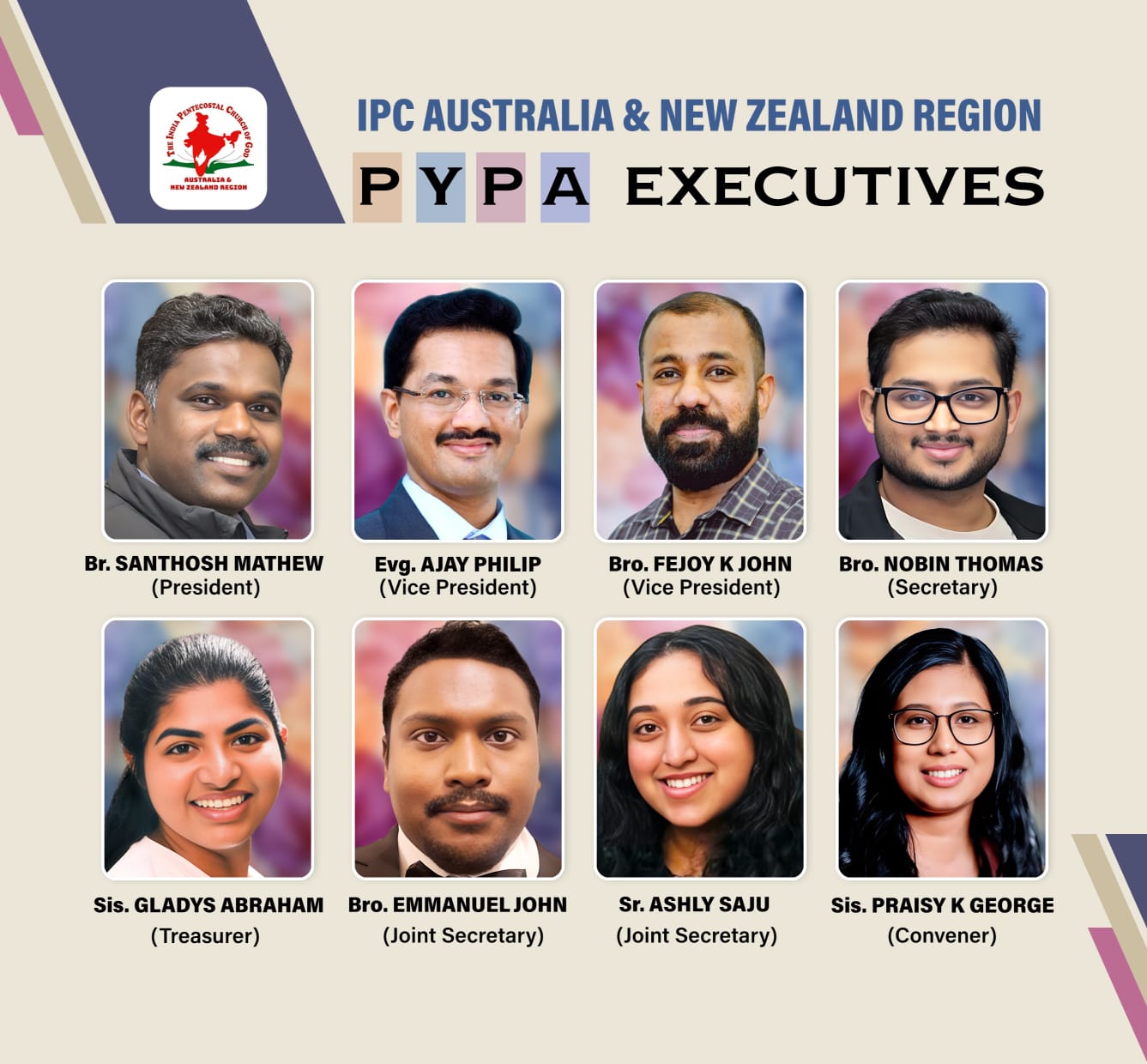 വൈസ് പ്രസിഡന്റ്: ഫിജോയ് കെ ജോൺ, ഇവാ. അജയ് ഫിലിപ്പ് സെക്രട്ടറി: നൊബിൻ തോമസ്