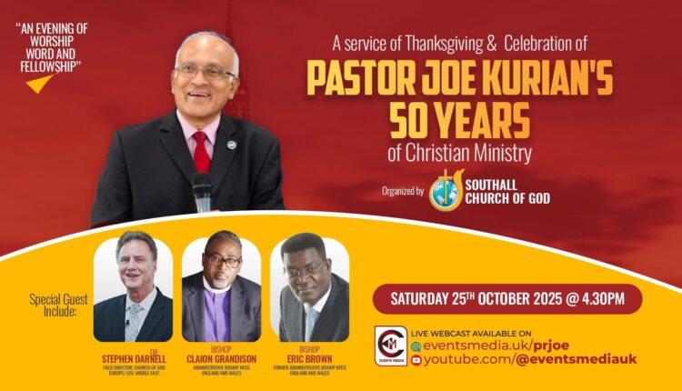 സൗത്ത്ഓൾ/(യുകെ): സുവിശേഷ പ്രവർത്തനത്തിന്റെ 50 വർഷങ്ങൾ പിന്നിട്ടുന്ന ചർച്ച് ഓഫ് ഗോഡ് യു കെ ക്രോസ്സ് കൾച്ചറൽ മിനിസ്ട്രീസ് ഡയറക്ടറും സൗത്ത്ഓൾ ചർച്ച് ഓഫ് ഗോഡ് സീനിയർ പാസ്റ്ററുമായ റവ.ഡോ.ജോ കുര്യന് സൗത്ത്ഓൾ ചർച്ച് ഓഫ് ഗോഡ് സഭയുടെ ആഭിമുഖ്യത്തിൽ അനുമോദന സമ്മേളനം നാളെ ഒക്ടോബർ 25 ന് വൈകിട്ട് 4.30 ന് (BST) നടക്കും. ലണ്ടൻ സ്കൂൾ ഓഫ് മിനിസ്ട്രീസ് ആൻഡ് തീയോളജിയുടെ പ്രിൻസിപ്പാളും ചർച്ച് ഓഫ് ഗോഡ് യു കെ & ഇ യു മലയാളം സെക്ഷൻ ഡയറക്ടറും യൂറോപ്പ്യൻ മലയാളി പെന്തെക്കൊസ്തൽ കമ്മ്യൂണിറ്റി (ഇ എം പി സി) ഡയറക്ടറുമാണ് പാസ്റ്റർ ജോ കുര്യൻ. സൗത്ത്ഓൾ ഡോർമെർസ് വെൽസ് ലൈനിൽ നടക്കുന്ന സമ്മേളനത്തിൽ ചർച്ച് ഓഫ് ഗോഡ് യൂറോപ്പ് / സി ഐ എസ് / മിഡിൽ ഈസ്റ്റ് ഫീൽഡ് ഡയറക്ടർ ഡോ സ്റ്റീഫൻ ഡാർനെൽ, എൻ റ്റി സി ജി ഇംഗ്ലണ്ട് & വെയിൽസ് അഡ്മിനിസ്ട്രേറ്റീവ് ബിഷപ്പ് ക്ലേയോൺ ഗ്രാൻഡിസൻ, എൻ റ്റി സി ജി ഇംഗ്ലണ്ട് & വെയിൽസ് മുൻ അഡ്മിനിസ്ട്രേറ്റീവ് ബിഷപ്പ് എറിക്ക് ബ്രോൺ എന്നിവരും യുകെയിലെ മറ്റ് സഭാ ശുശ്രൂഷകരും പങ്കെടുക്കും.