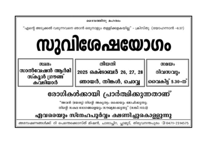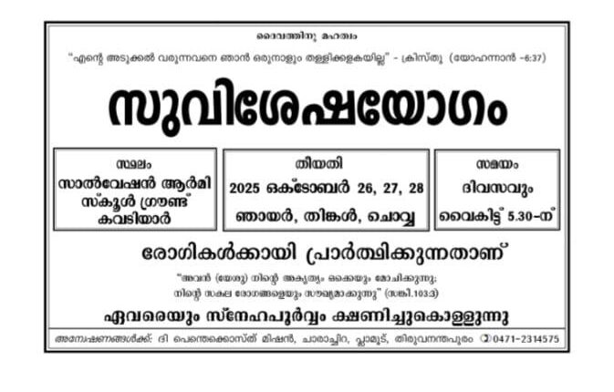 തിരുവനന്തപുരം: ദി പെന്തെക്കൊസ്ത് മിഷൻ തിരുവനന്തപുരം സെന്ററിന്റെ ആഭിമുഖ്യത്തിൽ സുവിശേഷ യോഗം ഇന്ന് ഒക്ടോബർ 26 മുതൽ 28 ചൊവ്വ വരെ വൈകിട്ട് 5.30 ന് കവടിയാർ സാൽവേഷൻ ആർമി സ്കൂൾ ഗ്രൗണ്ടിൽ വെച്ച് നടക്കും. സഭയുടെ സീനിയർ ശുശ്രൂഷകർ യോഗത്തിൽ പ്രസംഗിക്കും. സുവിശേഷ പ്രവർത്തകർ സംഗീത ശുശ്രൂഷയ്ക്ക് നേതൃത്വം നൽകും.