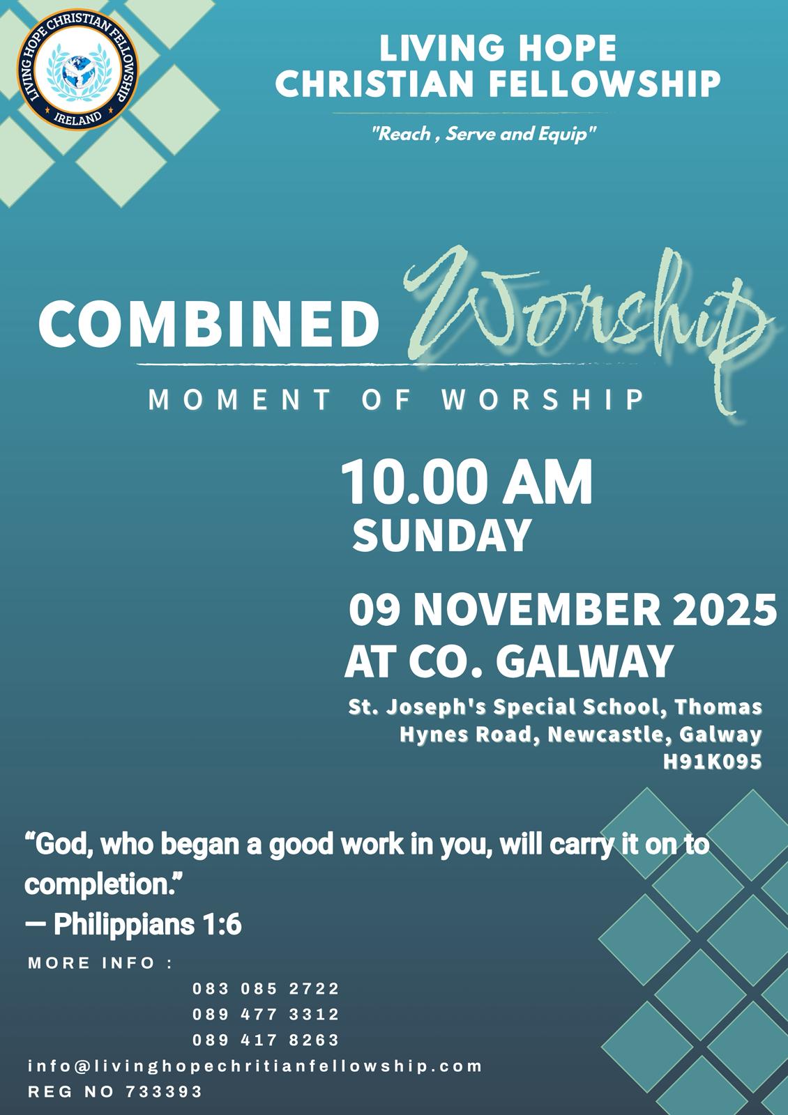 ഗാൽവേ,അയർലൻഡ്: ലിവിങ് ഹോപ്പ് ക്രിസ്ത്യൻ ഫെലോഷിപ്പ് അയർലൻഡിന്റെ മലയാളം കൂട്ടായ്മ ഗാൽവേയിൽ സംയുക്ത സഭായോഗത്തോടൊപ്പം ആരംഭിക്കുന്നു. ഈ കൂട്ടായ്മ സെയിന്റ് ജോസഫ്സ് സ്പെഷ്യൽ സ്കൂളിൽ (Thomas Hynes Road, New Castle, Galway H91K095) വച്ച് നവംബർ 9 ന് രാവിലെ 10 മണി മുതൽ നടക്കും. പാസ്റ്റർ ബിജു മാത്യു ശുശ്രൂഷകൾക്ക് നേതൃത്വം നൽകുന്നു, ഏവരെയും സ്വാഗതം ചെയ്യുന്നു.