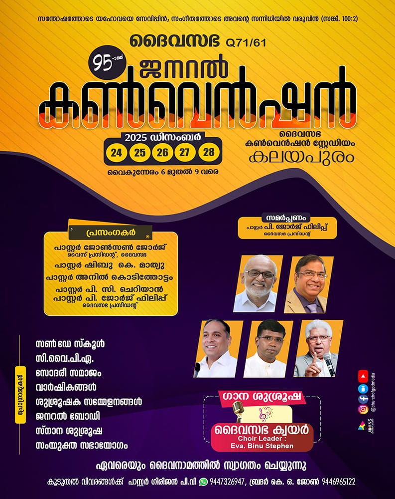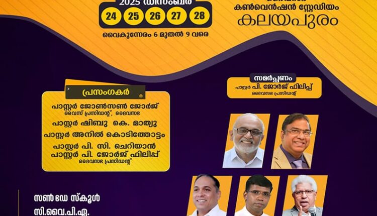 കലയപുരം : 95 മത് ദൈവസഭ കൺവെൻഷൻ 2025 ഡിസംബർ 24 മുതൽ 28 വരെ കലയപുരം ദൈവസഭ കൺവെൻഷൻ സ്റ്റേഡിയത്തിൽ നടക്കും. ദൈവസഭ പ്രസിഡന്റ് പാസ്റ്റർ പി. ജോർജ്ജ് ഫിലിപ്പ് സമർപ്പണ ശുശ്രൂഷ നിർവ്വഹിക്കും. എല്ലാ ദിവസവും രാത്രി 6 മുതൽ 9 വരെ നടക്കുന്ന രാത്രി യോഗങ്ങളിൽ ദൈവസഭ വൈസ് പ്രെസിഡന്റ്റ് പാസ്റ്റർ ജോൺസൻ ജോർജ്ജ്, പാസ്റ്റർമാരായ ഷിബു കെ. മാത്യു , അനിൽ കൊടിത്തോട്ടം, പി. സി. ചെറിയാൻ എന്നിവർ ദൈവവചനം ശുശ്രൂഷിക്കും. വെള്ളിയാഴ്ച പകൽ 10 മുതൽ സൺഡേ സ്കൂൾ സി.വൈ.പി.ഏ വാർഷികവും, ശനിയാഴ്ച പകൽ 10 മുതൽ സോദരി സമാജം വാർഷികവും ഉണ്ടായിരിക്കും. ശുശ്രൂഷകന്മാരുടെ സമ്മേളനം, മിഷൻ ചലഞ്ചു, ജനറൽ ബോഡി ബൈബിൾ ക്ലാസ്സ് എന്നിവയും വിവിധ സെഷനുകളിൽ ക്രമീകരിച്ചിട്ടുണ്ട്. 28 ഞായറാഴ്ച രാവിലെ 8 മണിക്ക് നടക്കുന്ന സ്നാനശുശ്രൂഷയ്ക്ക് പാസ്റ്റർ ഒ. തങ്കച്ചൻ നേതൃത്വം നൽകും. അന്നേ ദിവസം രാവിലെ 9.30 മുതൽ ദൈവസഭകളുടെ സംയുക്ത സഭായോഗവും നടക്കും. ശുശ്രൂഷകന്മാർക്കുള്ള ഓർഡിനേഷൻ ശുശ്രൂഷയും നടക്കും. സംയുക്ത സഭായോഗത്തിൽ ദൈവസഭ പ്രസിഡന്റ്റ് പാസ്റ്റർ പി. ജോർജ്ജ് ഫിലിപ്പ് ദൈവവചനം ശുശ്രൂഷിക്കും. ശുശ്രൂഷക സമ്മേളനം, പാസ്റ്റർ ബിനു ചാരുതയുടെ നേതൃത്വത്തിലുള്ള ദൈവസഭ ക്വയർ സംഗീത ശുശ്രൂഷയും നിർവഹിക്കും കൺവെൻഷന്റെ അനുഗ്രഹീത നടത്തിപ്പിന് വേണ്ടി ദൈവസഭ പ്രസിഡന്റ് ജനറൽ കൺവീനർ ആയി വിപുലമായ ഒരു കമ്മിറ്റിയും പ്രവർത്തിച്ചു വരുന്നു.