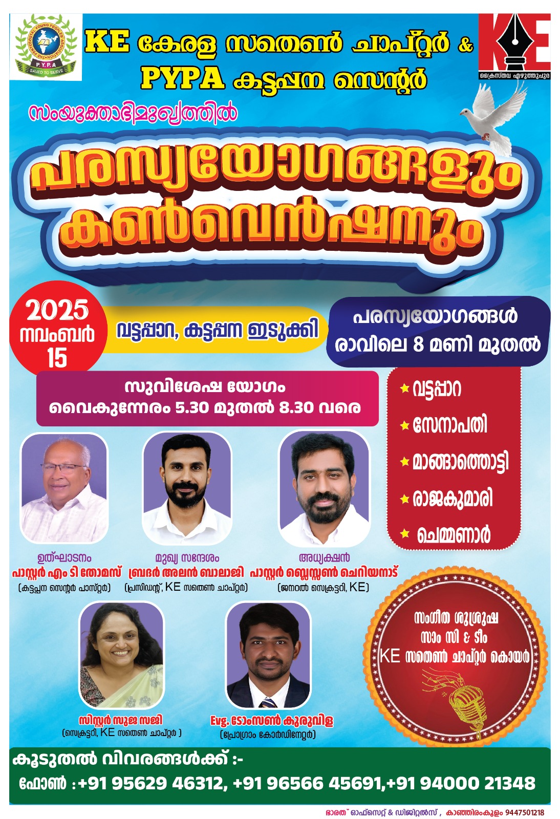 വട്ടപ്പാറ: ക്രൈസ്തവ എഴുത്തുപുര സതേൺ ചാപ്റ്ററും ഇന്ത്യ പെന്തക്കോസ്ത് ദൈവസഭ കട്ടപ്പന സെന്റർ പി.വൈ.പി.എ യുടെയും സംയുക്താഭിമുഖ്യത്തിൽ രാവിലെ 9 മണി മുതൽ വൈകുന്നേരം 3 മണി വരെ വട്ടപ്പാറ സേനാപതി, മാങ്ങാത്തൊട്ടി, രാജകുമാരി, ചെമ്മണ്ണാർ,എന്നീ പ്രദേശങ്ങളിൽ പരസ്യയോഗവും വൈകുന്നേരം 5.30.മുതൽ 8.30 വരെ വട്ടപ്പാറ ഐ. പി. സി ഏബനേസർ സഭയിൽ വെച്ച് കൺവെൻഷനും നടത്തപ്പെടുന്നു. ക്രൈസ്തവ എഴുത്തുപുര ജനറൽ സെക്രട്ടറി പാസ്റ്റർ ബ്ലെസ്സൺ ചെറിയനാടിന്റ അധ്യക്ഷതയിൽ ഐ.പി.സി കട്ടപ്പന സെന്റർ മിനിസ്റ്റർ പാസ്റ്റർ എം.ടി തോമസ് ഉദ്ഘാടനം ചെയ്യും. കേരള സൗതേൺ ചാപ്റ്റർ പ്രസിഡന്റ് ബ്രദർ അലൻ ബാലാജി ദൈവവചനം പ്രഘോഷിക്കും. ക്രൈസ്തവ എഴുത്തുപുര കേരള സൗതേൺ ചാപ്റ്റർ സെക്രട്ടറി സിസ്റ്റർ സുജാ സജിയുടെ സാന്നിധ്യവും അന്നുണ്ടായിരിക്കും. സൗതേൺ ചാപ്റ്റർ വൈസ് പ്രസിഡന്റ് ബ്രദർ.സാംസി യുടെ നേതൃ ത്വത്തിൽ കേരള സൗതേൺ ചാപ്റ്റർ കോയർ സംഗീത ശുശ്രൂഷ നിർവഹിക്കും. ക്രൈസ്തവ എഴുത്തുപുര കേരള സൗതേൺ ചാപ്റ്ററിന്റെ ജോയിൻ സെക്രട്ടറിയായും ഐ.പി.സി കട്ടപ്പന സെന്റർ പി.വൈ.പി.എ യുടെ പ്രസിഡന്റായും സേവനം അനുസരിക്കുന്ന സുവിശേഷകൻ ടോംസൺ കുരുവിള ഈ മീറ്റിംഗുകൾക്ക് നേതൃത്വം നൽകും.ഈ അനുഗ്രഹിക്കപ്പെട്ട യോഗത്തിലേക്ക് എല്ലാവരെയും സ്വാഗതം ചെയ്യുന്നു.