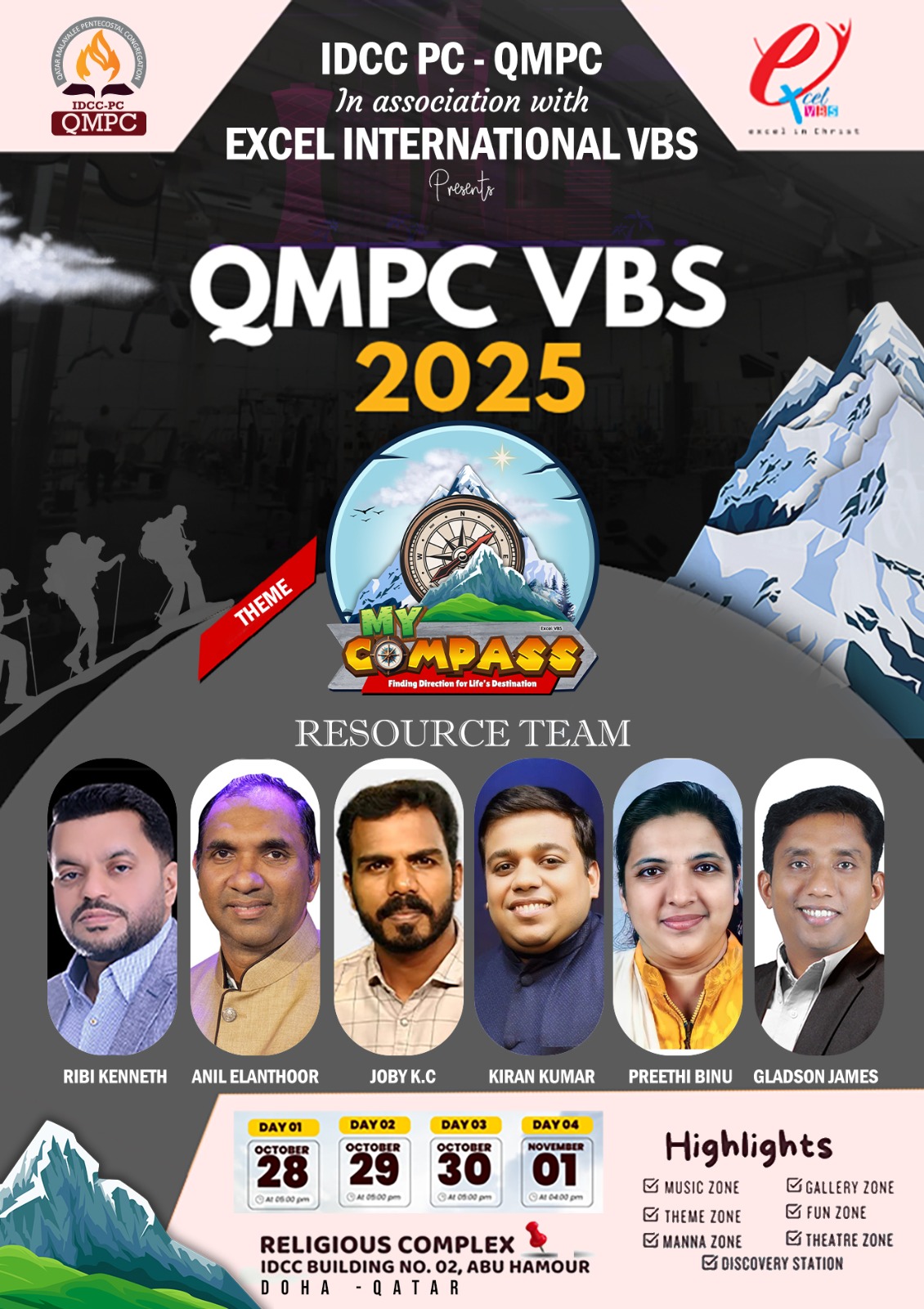 ദോഹ: ഖത്തർ മലയാളി പെന്തക്കോസ്തൽ കോൺഗ്രിഗേഷൻ നേതൃത്വം നൽകുന്ന QMPC വിബിഎസ് 2025 ഒക്ടോബർ 28 ചൊവ്വാഴ്ച വൈകീട്ട് 5 മണിക്ക് ദോഹ റിലീജിയസ് കോംപ്ലക്സിൽ ആരംഭിക്കുന്നു. മൈ കോമ്പസ് (സങ്കീർത്തനം 43:3) എന്ന ചിന്താവിഷയത്തിൽ പ്രമുഖ ബാലസുവിശേഷീകരണ പ്രവർത്തനമായ എക്സൽ മിനിസ്ട്രീസ് ടീമംഗങ്ങളായ അനിൽ ഇലന്തൂർ , റിബി കെന്നത്ത്, ജോബി.കെ.സി, കിരൺ കുമാർ, ഗ്ലാഡ്സൻ ജയിംസ്, പ്രീതി ബിനു എന്നിവർ നേതൃത്വം നൽകും . 800 ൽ അധികം കുട്ടികൾ ഒത്തു ചേരുന്ന അവധിക്കാല വചനപഠനത്തിന് പാസ്റ്റർ സാം ടി ജോർജ് (പ്രസിഡൻ്റ് ) ഉത്ഘാടനം നിർവഹിക്കും. ബിജോ മാത്യു (സെക്രട്ടറി), പാസ്റ്റർ. ജോർജ്ജ് മാത്യു (കോഡിനേറ്റർ), കെൻ അൽഫോൻസ് (ജോയിൻ്റ് സെക്രട്ടറി), ജോജിൻ വി മാത്യു (ട്രഷറർ), പാസ്റ്റർ . ജോസ് ബേബി (പാസ്റ്റേഴ്സ് കൌൺസിൽ സെക്രട്ടറി) എന്നിവർ QMPC VBS ൻ്റെ വിവിധ ചുമതലകൾ നിർവഹിക്കുന്നു