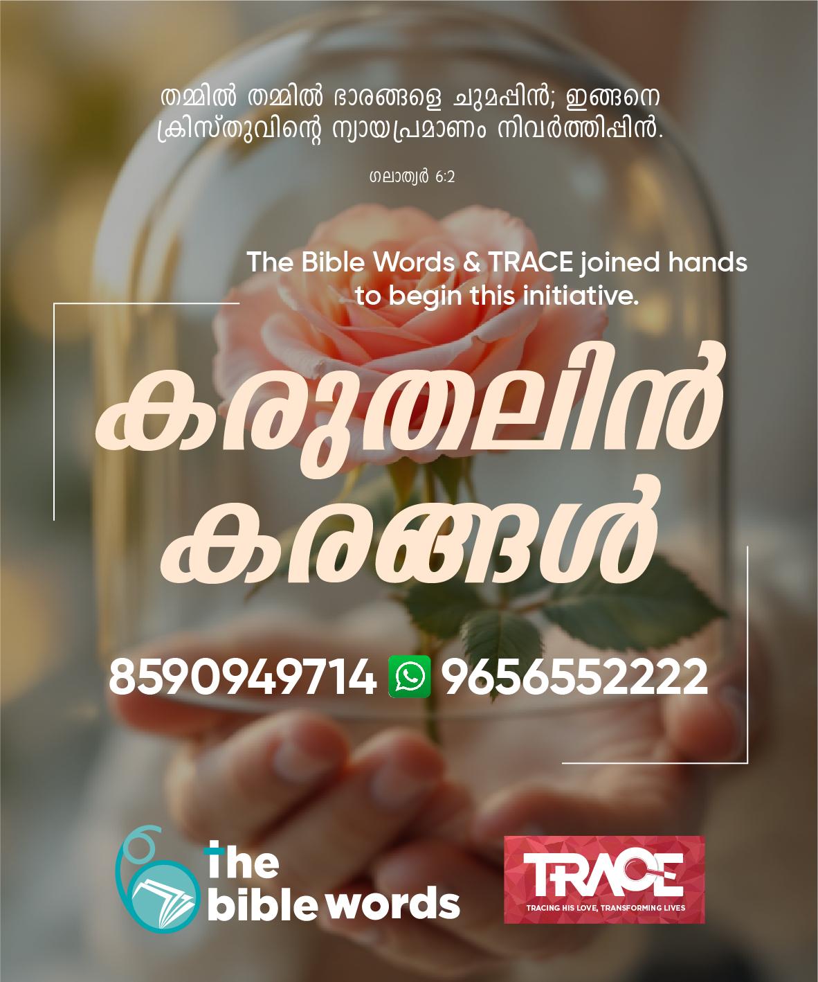 ദീർഘകാലങ്ങളായി സുവിശേഷ വേലയിൽ ആത്മാർത്ഥമായി പ്രവർത്തിച്ചുവരുന്ന ദൈവദാസന്മാർക്കും, ഗുരുതര രോഗങ്ങളാൽ ബുദ്ധിമുട്ടുന്നവർക്കും ആശ്വാസഹസ്തമായി The Bible Words ഉം Trace ഉം ഒന്നിക്കുന്നു. നാല്പത് വർഷത്തിലധികമായി കർത്താവിന്റെ വേലയിൽ നിസ്വാർത്ഥമായി സേവനം ചെയ്തുവരുന്ന, സാമ്പത്തികമായി അത്യന്തം ബുദ്ധിമുട്ടുന്ന മുതിർന്ന ദൈവദാസന്മാരുടെ അടിയന്തിര ആവശ്യങ്ങൾ നിറവേറ്റുന്നതിനും, മാരകമായ രോഗങ്ങളാൽ വലയുന്ന ദൈവജനങ്ങളുടെ പ്രധാന ചികിത്സകൾക്കും ആശുപത്രി ചെലവുകൾക്കും കൈത്താങ്ങാവുക എന്ന ഉദ്ദേശത്തോടെയാണ് ഈ പദ്ധതിക്ക് തുടക്കം കുറിച്ചിരിക്കുന്നത്.