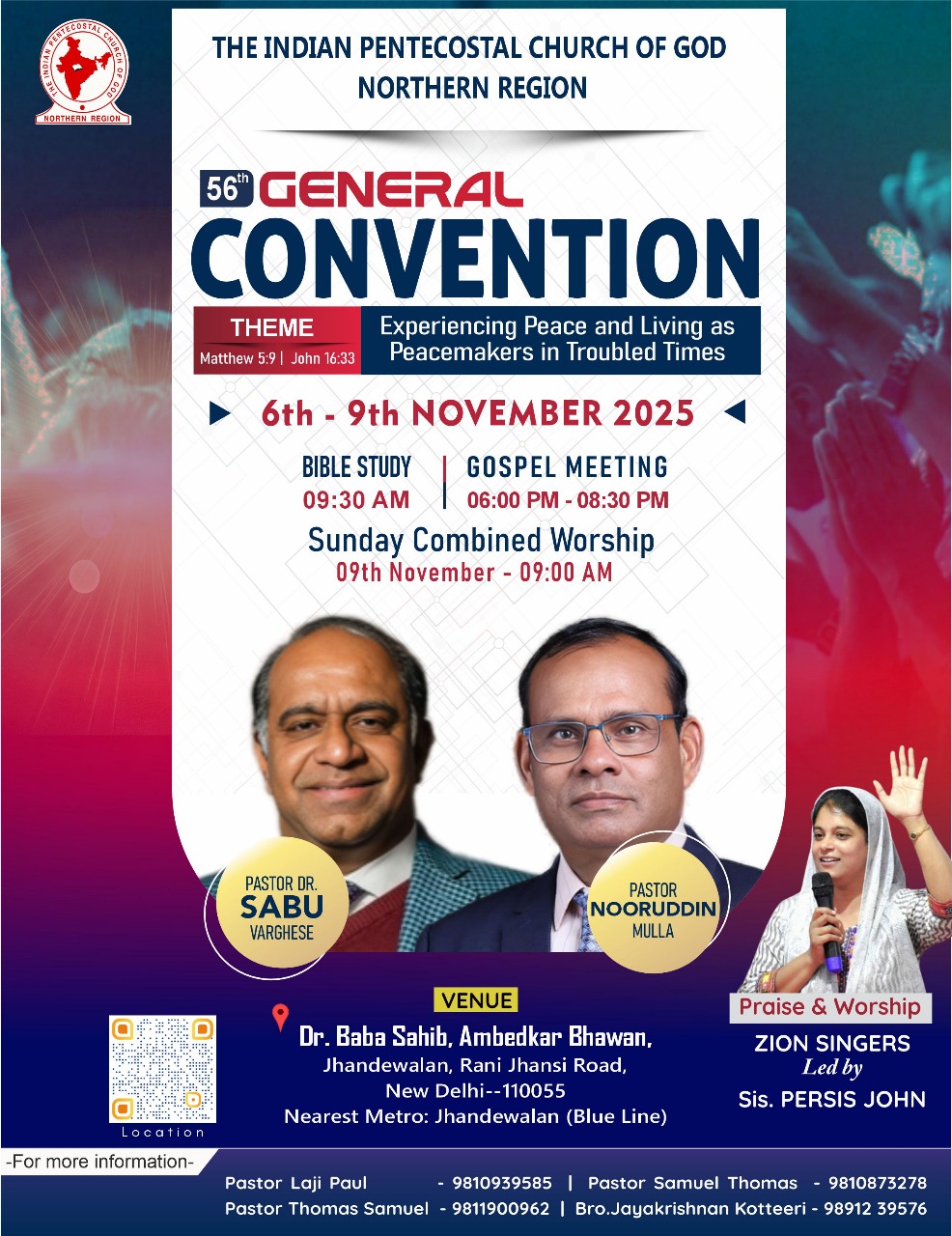 ന്യൂഡൽഹി: ഐ.പി.സി. നോർത്തേൺ റീജിയന്റെ 56-ാമത് ജനറൽ കൺവൻഷനു അനുഗ്രഹീത തുടക്കം. ഡൽഹി ജണ്ഡേവാലയിലെ അംബേദ്കർ ഭവനിൽ വെച്ച് നടക്കുന്ന കൺവൻഷൻ ഐ.പി.എൻ.ആർ വർക്കിംഗ് പ്രസിഡൻ്റ് ഡോ. ലാജി പോൾ ഉത്ഘാടനം ചെയ്തു. പാസ്റ്റർ. സജോയ് വർഗീസ് അദ്ധ്യക്ഷത വഹിച്ചു. “അശാന്തിയുടെ നാളുകളിൽ സമാധാനം അനുഭവിക്കുകയും സമാധാനം ഉണ്ടാക്കുന്നവരായി ജീവിക്കുകയും ചെയ്ക” എന്ന വിഷയത്തെ ആസ്പദമാക്കി, യഥാർത്ഥ സമാധാനം ക്രിസ്തുവിൽ മാത്രമേ കണ്ടെത്തുവാൻ സാധിക്കുകയുള്ളൂ എന്ന് തൻ്റെ ഉത്ഘാടന സന്ദേശത്തിൽ അദ്ദേഹം പ്രസ്താവിച്ചു.