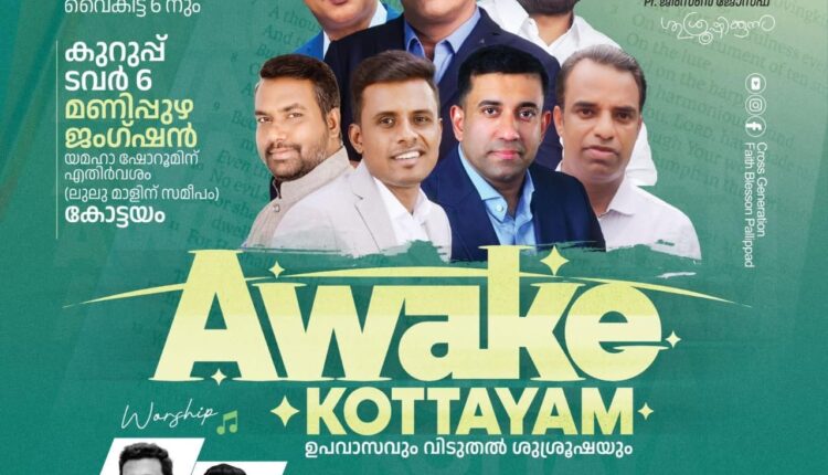 കോട്ടയം: ക്രോസ് ജനറേഷൻ (Cross Generation) ഒരുക്കുന്ന ആത്മീയ ഉണർവിന്റെ ശുശ്രൂഷാ മഹായോഗമായ എവൈക്ക് കോട്ടയം” ഡിസംബർ 14 മുതൽ 21 വരെ.കൂറുപ്പ് ടവർ 6, മണിപ്പുഴ, യമഹാ ഷോറൂമിന് എതിർ വശം (കോട്ടയം ലുലു മാളിന് സമീപം) നടക്കും. എല്ലാദിവസവും രാവിലെ 10 മണിക്കും വൈകുന്നേരം 6 മണിക്കും യോഗങ്ങൾ നടക്കും. പാസ്റ്ററുമാരായ ബിജു.സി എക്സ്, റെജി മാത്യു, ഷിബിൻ ശാമുവേൽ, ജെയ്സൻ ജോസഫ്, ആൻസൻ മാത്യൂ, സാം മാത്യൂ, ജിംസൻ ജോസഫ് തുടങ്ങിയവർ ദൈവ വചനം ശുശ്രൂഷിക്കും.