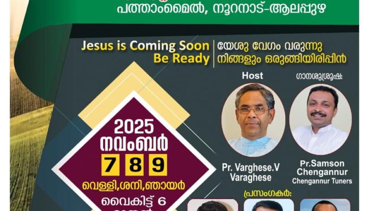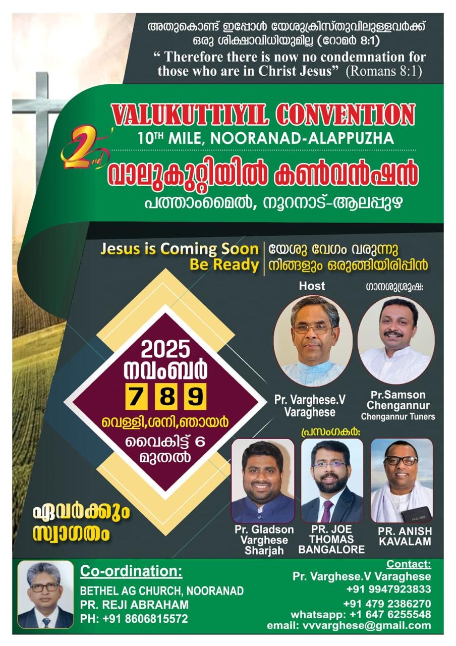ആലപ്പുഴ: രണ്ടാമത് വാലുകുറ്റിയിൽ കൺവൻഷനും സംഗീത വിരുന്നും നവംബർ 7, 8, 9 തീയതികളിൽ പാസ്റ്റർ വർഗീസ് വി വർഗീസിന്റെ ഭവനാങ്കണത്തിൽ വച്ച് നടത്തപ്പെടും.