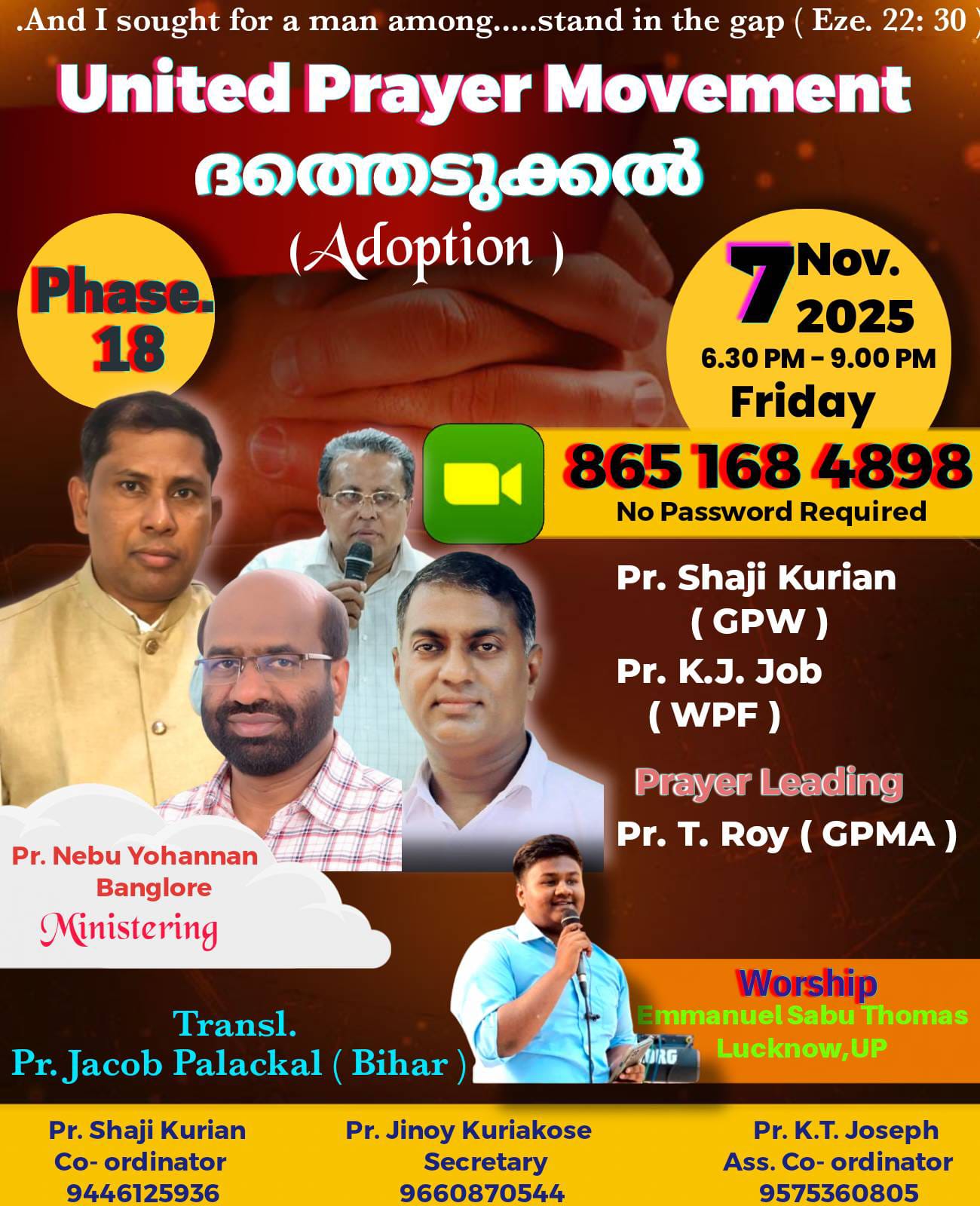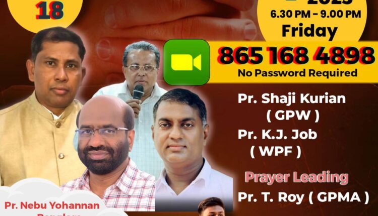 ന്യൂഡൽഹി : ഭാരതത്തിലെ വിവിധ പ്രാർത്ഥന മൂവ്മെന്റുകളെ ഏകോപിപ്പിച്ചുകൊണ്ട് നവംബർ ഏഴിന് നാളെ വെള്ളിയാഴ്ച വൈകുന്നേരം 6:30 മുതൽ 9:00 വരെ . സംയുക്ത പ്രാർത്ഥനാ സമ്മേളനം സൂംപ്ലാറ്റ്ഫോമിൽ നടക്കും. വർത്തമാനകാല സാഹചര്യങ്ങളാണ് പ്രാർത്ഥന വിഷയങ്ങൾ. സഹകാരികളായ