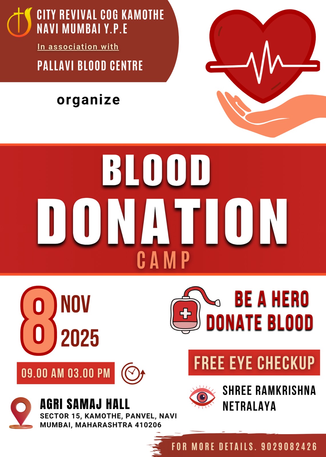 സിറ്റി റിവൈവൽ ചർച്ച് ഓഫ് ഗോഡ് കാമോത്തെ സഭയുടെ രക്തദാന ക്യാമ്പും സൗജന്യ നേത്ര പരിശോധനയും നവംബർ 8-ന് നവി മുംബൈയിൽ