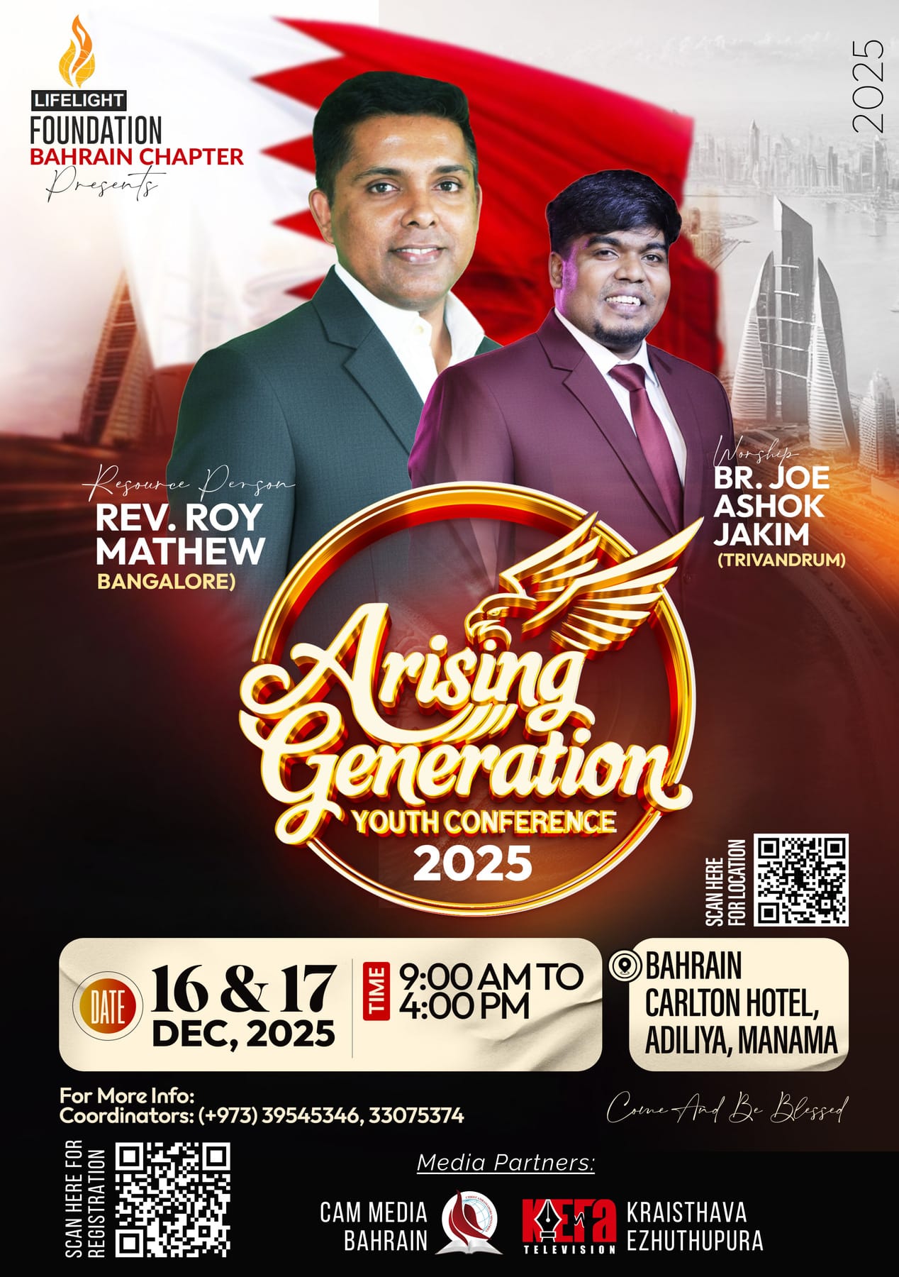 ബഹറിൻ: യുവജനങ്ങൾക്കും, കൗമാരക്കാർക്കും വേണ്ടി ക്രിയാത്മകമായ പ്രോഗ്രാമുകൾ ചേർത്ത് ഇണക്കിക്കൊണ്ട് രണ്ടു ദിവസത്തെ യൂത്ത് കോൺഫറൻസ് ബഹറിൻ കാൾട്ടൺ ഹോട്ടൽ,അടിലിയ, മനാമ വെച്ച് ഡിസംബർ മാസം 16,17 തീയതികളിൽ രാവിലെ 9 മണി മുതൽ വൈകിട്ട് 4 മണി വരെ നടത്തപ്പെടുന്നു.