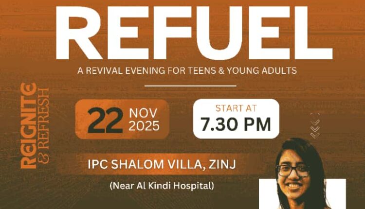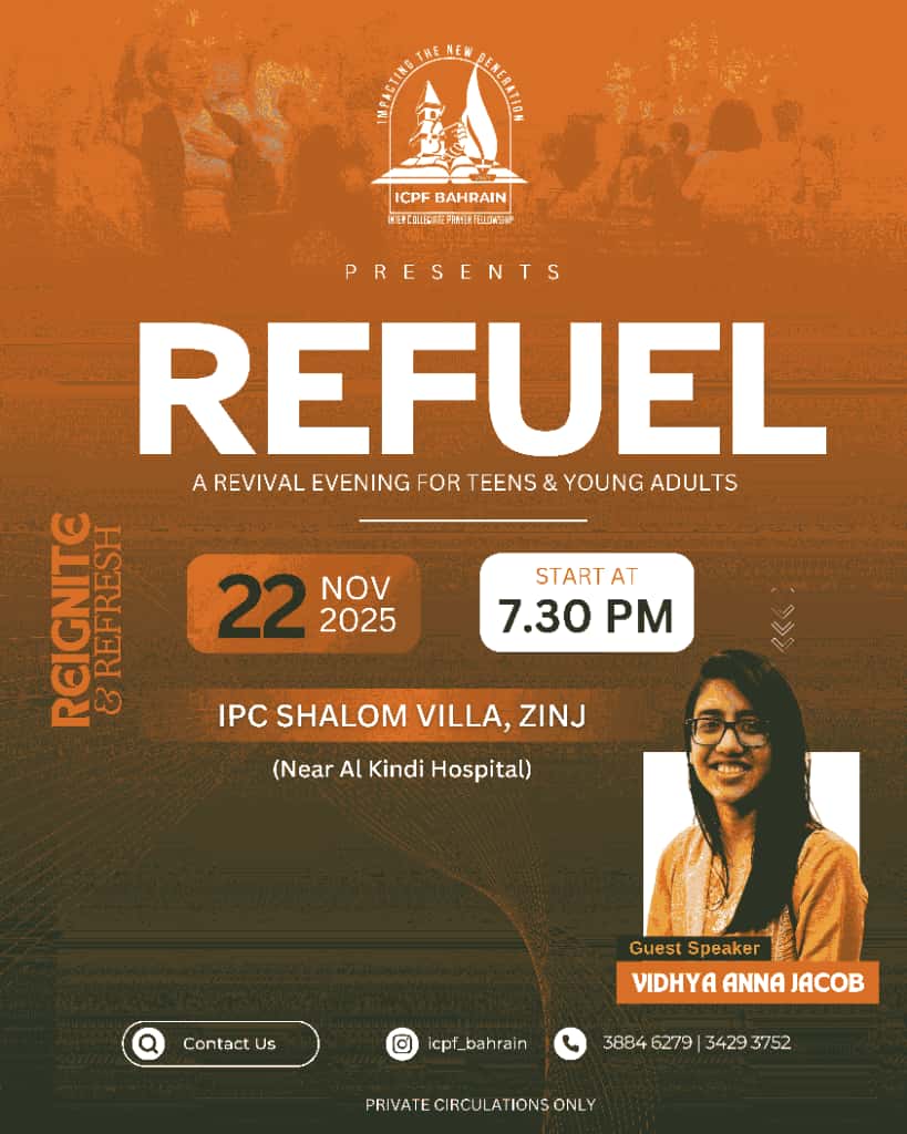 മനാമ: ഐ സി പി ഫ് ബഹ്റൈൻ ഒരുക്കുന്ന റെഫ്യൂൽ സെമിനാർ & ക്ലാസ് (A revival evening for teens & young adults) 22 നവംബർ 2025 വൈകിട്ടു 07:30ന് ഐ പി സി ശാലോം വില്ലയിൽ വെച്ചു നടത്തപ്പെടുന്നു സിസ്റ്റർ വിദ്യ അന്ന ജേക്കബ് ക്ലാസ്സുകൾക്ക് നേതുത്വം നൽകും