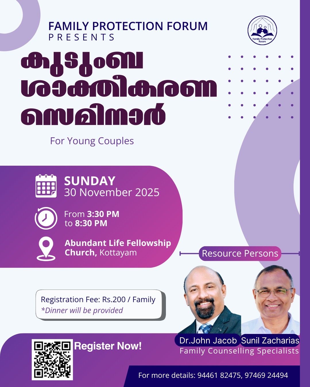 യുവകുടുംബങ്ങൾക്ക് ഏറെ പ്രയോജനകരമായ ഈ സെമിനാറിൽ പങ്കെടുക്കാൻ കൂടുതൽ പേർ മുന്നോട്ട് വരണമെന്ന് ഫാമിലി പ്രൊട്ടക്ഷൻ ഫോറം ഭാരവാഹികൾ പറഞ്ഞു.