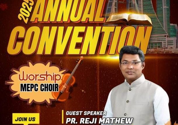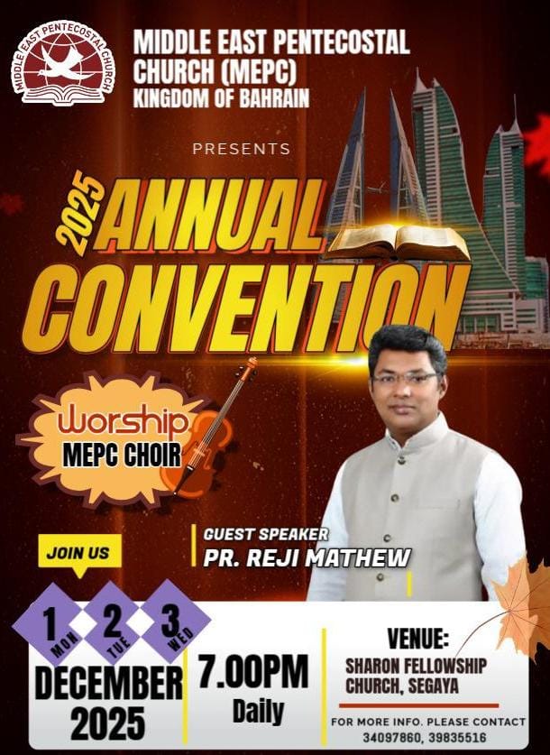 മനാമ: ബഹറിനിലെ ഉപദേശ ഐക്യമുള്ള മലയാളി പെന്തെക്കോസ്ത് സഭകളുടെ കൂട്ടായ്മയായ മിഡിൽ ഈസ്റ്റ് പെന്തെക്കോസ്തൽ ചർച്ച് (MEPC) സംഘടിപ്പിക്കുന്ന വാർഷിക കൺവെൻഷൻ 2025 ഡിസംബർ 1, 2, 3 തീയതികളിൽ നടക്കും. മനാമയിലെ സെഗായയിൽ സ്ഥിതിചെയ്യുന്ന ശാരോൻ ഫെല്ലോഷിപ്പ് ചർച്ച് (SFC) ഹാളിൽ എല്ലാ ദിവസവും വൈകുന്നേരം 7 മണി മുതൽ ആത്മീയ സമ്മേളനങ്ങൾ ആരംഭിക്കും.