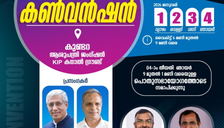 കുണ്ടറ: അസംബ്ലീസ് ഓഫ് ഗോഡ് മധ്യമേഖലയുടെ നേതൃത്വത്തിൽ ആദ്യമായി സംഘടിപ്പിക്കുന്ന മേഖല കൺവൻഷൻ ജനുവരി 1 മുതൽ 4 വരെ കുണ്ടറ ഹോസ്പിറ്റൽ ജംഗ്ഷനു സമീപമുള്ള കെ.ഐ.പി. കനാൽ ഗ്രൗണ്ടിൽ നടക്കും.