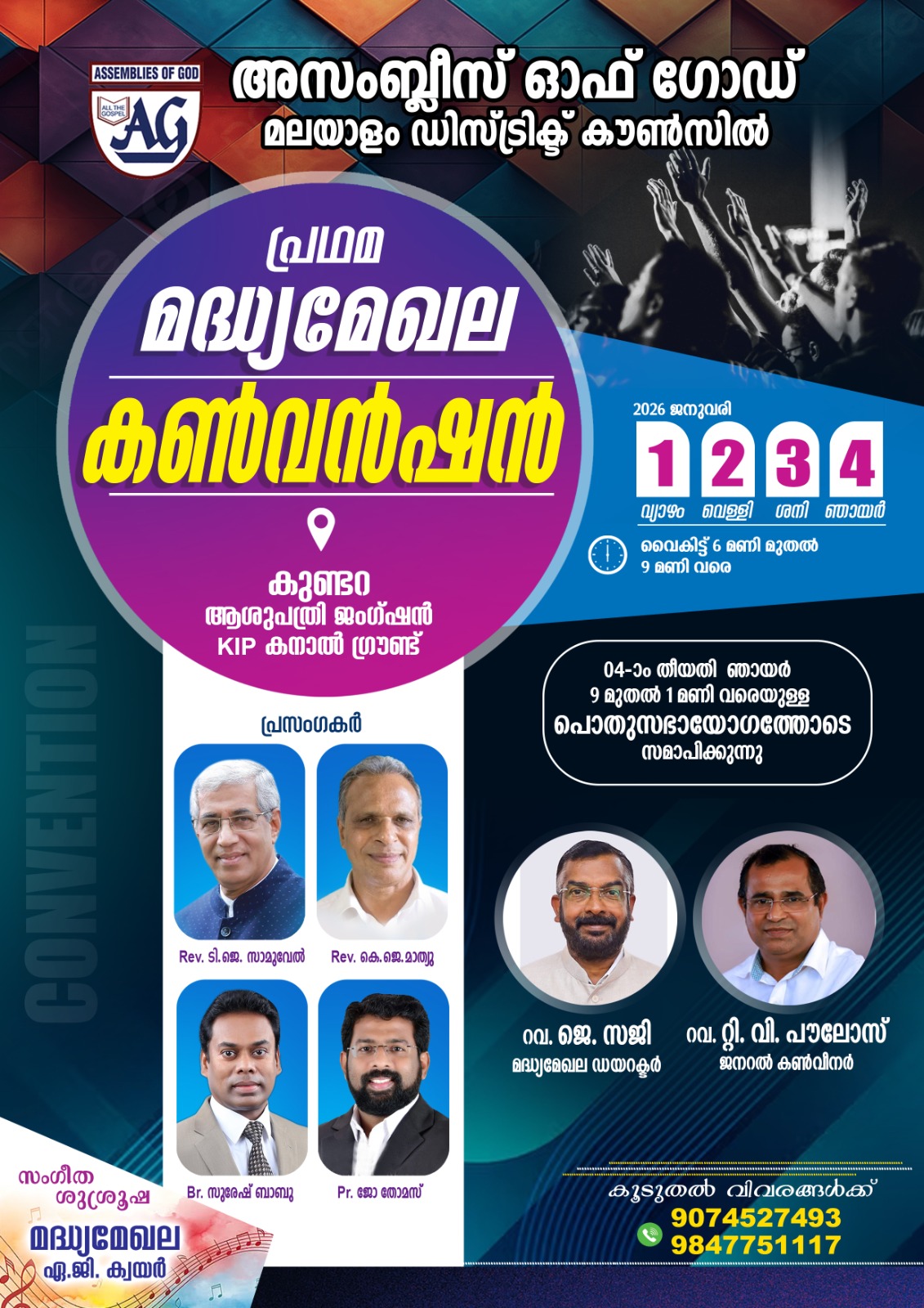 സംഗീതാരാധനക്ക് പാസ്റ്റർ വി. ടി. തോമസും ബ്രദർ സാംസൺ പത്തനാപുരവും ഉൾപ്പെടുന്ന മേഖലക്വയർ നേതൃത്വം നൽകും.