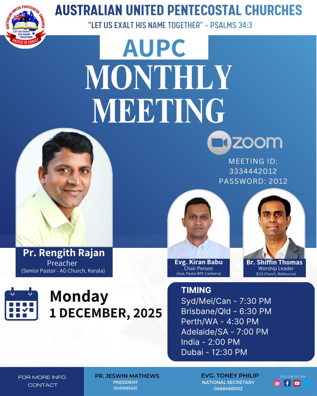 Australia: In a powerful display of spiritual dedication and unity, the Australian United Pentecostal Churches (AUPC) are set to host their monthly meeting of the year on Monday, 1 December 2025, bringing together believers from across Australia and beyond for an evening of worship, word, and fellowship. There is only one name for salvation called Jesus Christ, and there is only one name of unity in Australia called AUPC.