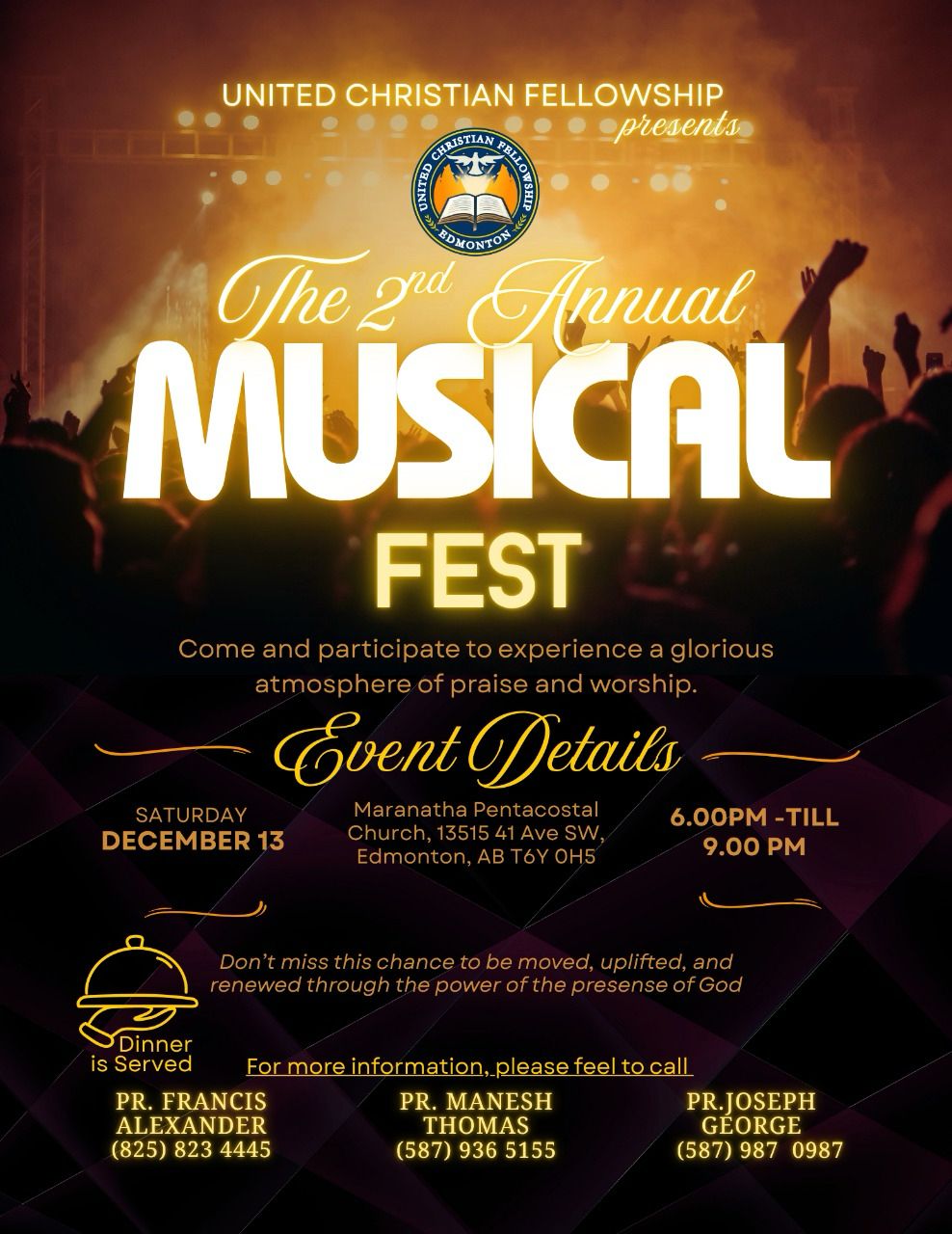 എഡ്മൺടൺ മലയാളം പെന്തക്കോസ്റ്റൽ ചർച്ചുകളുടെ പ്രഥമ കൂട്ടായ്മ — യുണൈറ്റഡ് ക്രിസ്ത്യൻ ഫെല്ലോഷിപ്പ് രണ്ടാം മ്യൂസിക് ഫെസ്റ്റ് 2025 ഡിസംബർ 13ന്