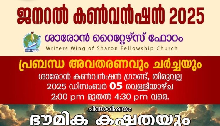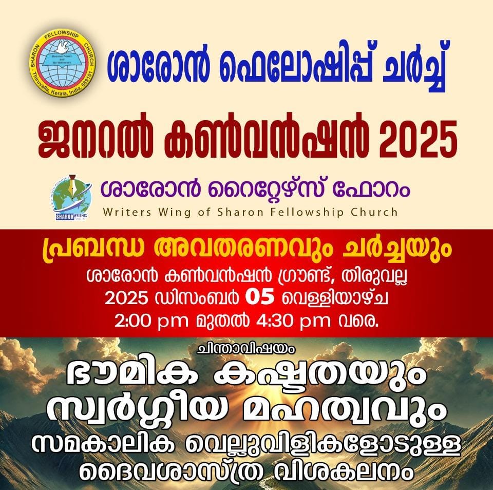 തിരുവല്ല: ശാരോൻ ഫെല്ലോഷിപ്പ് ചർച്ചിന്റെ പുത്രികാ സംഘടനയായ ശാരോൻ റൈറ്റേഴ്സ് ഫോറം പ്രബന്ധ അവതരണവും ചർച്ചയും ഡിസംബർ 5 വെള്ളിയാഴ്ച ഉച്ചയ്ക്ക് 2ന് തിരുവല്ല ശാരോൻ ഗ്രൗണ്ടിൽ നടക്കും. ‘ഭൗമീക കഷ്ടതയും സ്വർഗീയ മഹത്വവും സമകാലിക വെല്ലുവിളികളോടുള്ള ദൈവശാസ്ത്ര വിശകലനം’ എന്ന വിഷയത്തിൽ റൈറ്റേഴ്സ് ഫോറം ജനറൽ സെക്രട്ടറി പാസ്റ്റർ അനീഷ് കൊല്ലംകോട് ക്ലാസ്സെടുക്കും.
